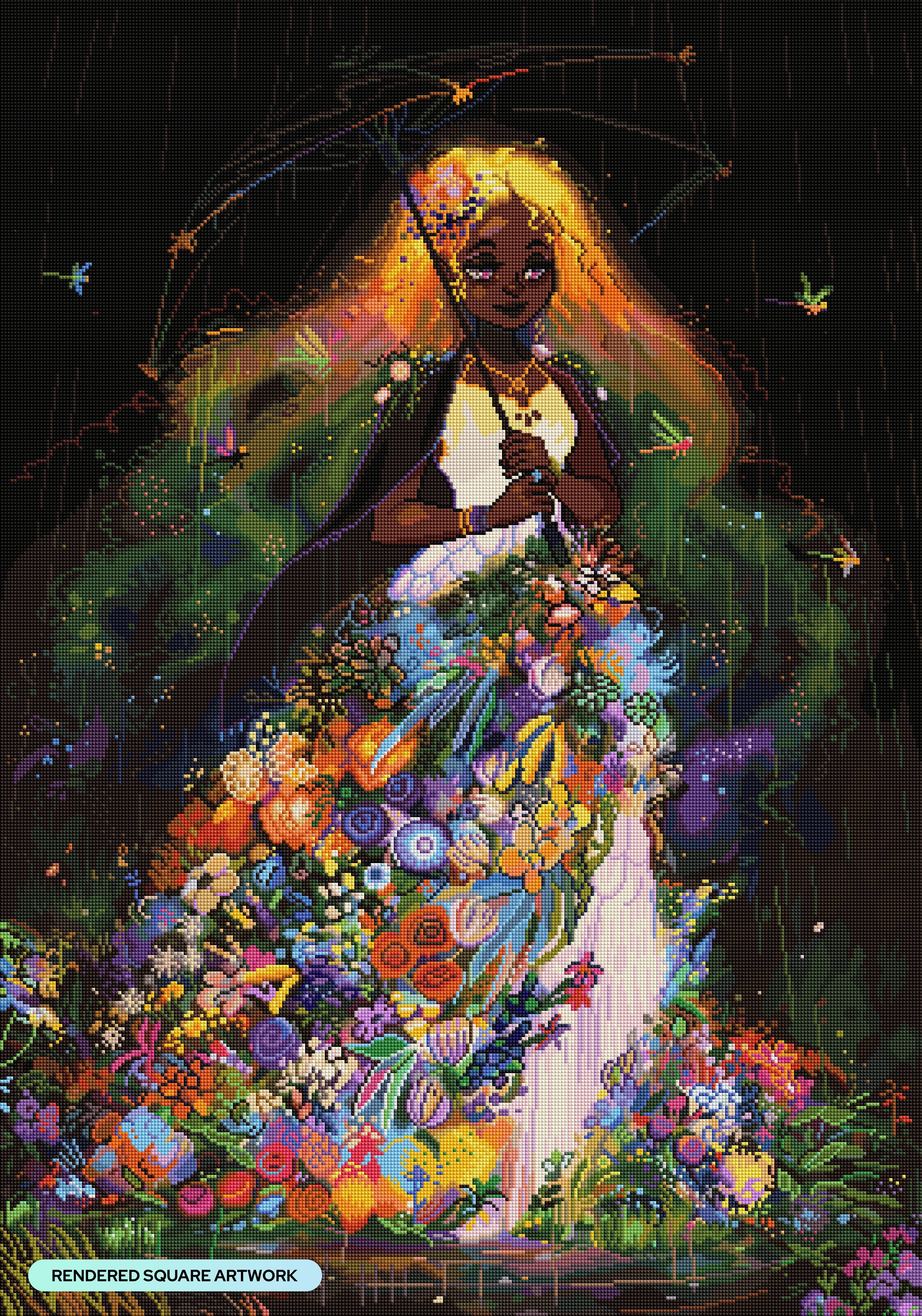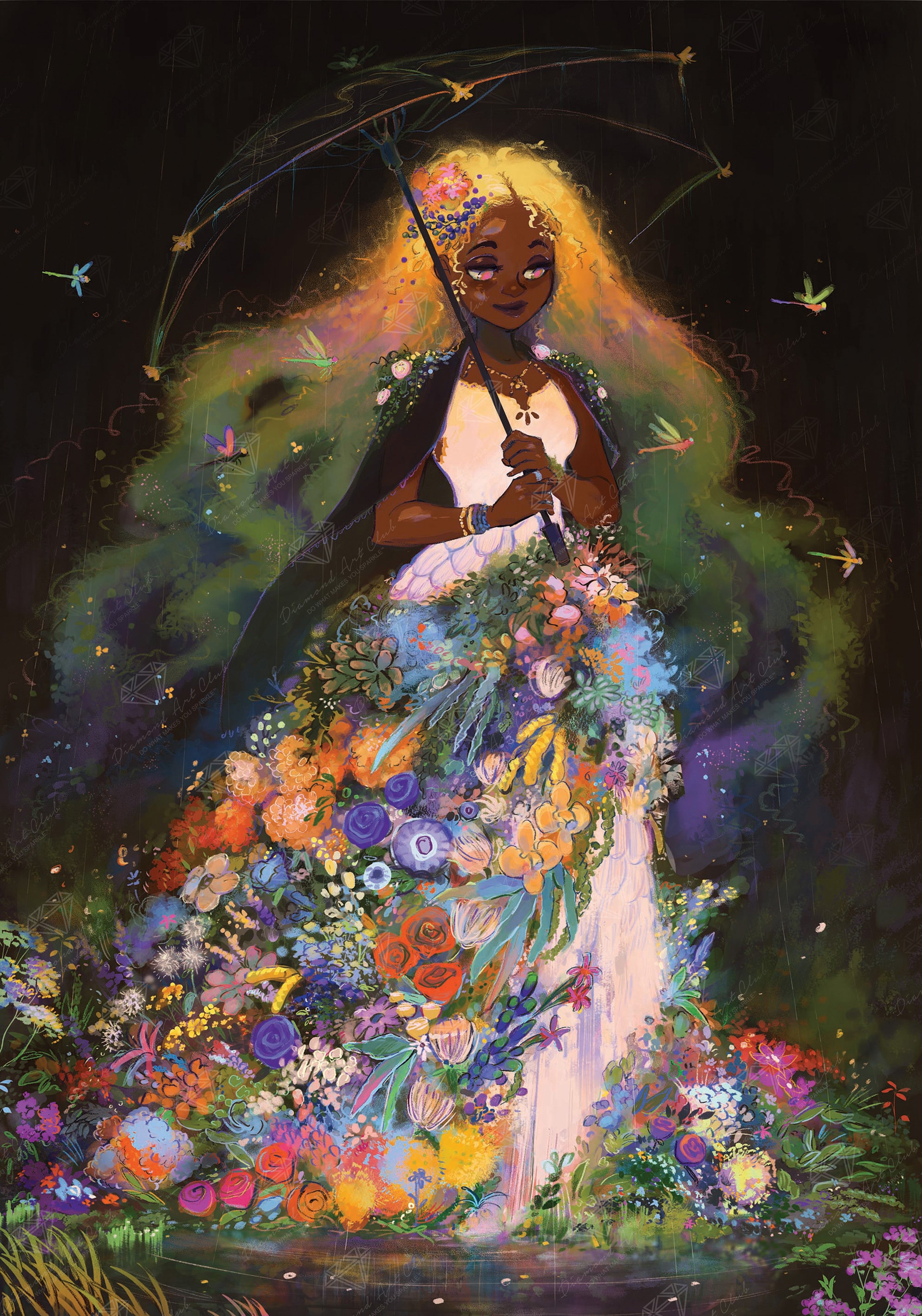 Wander through an enchanting, rain-filled evening adorned in a gown of fresh blossoms. Discover strength in the radiant defiance of the downpour and energy in the hum of luminous dragonflies.