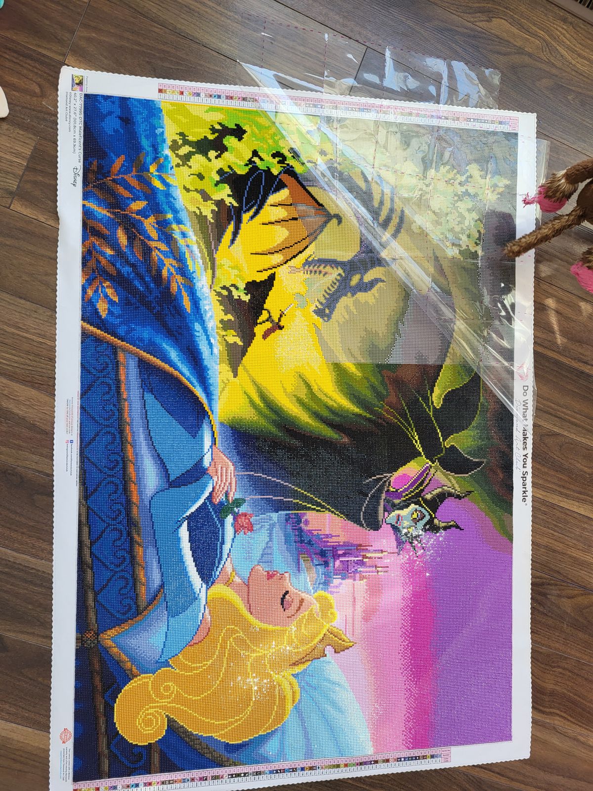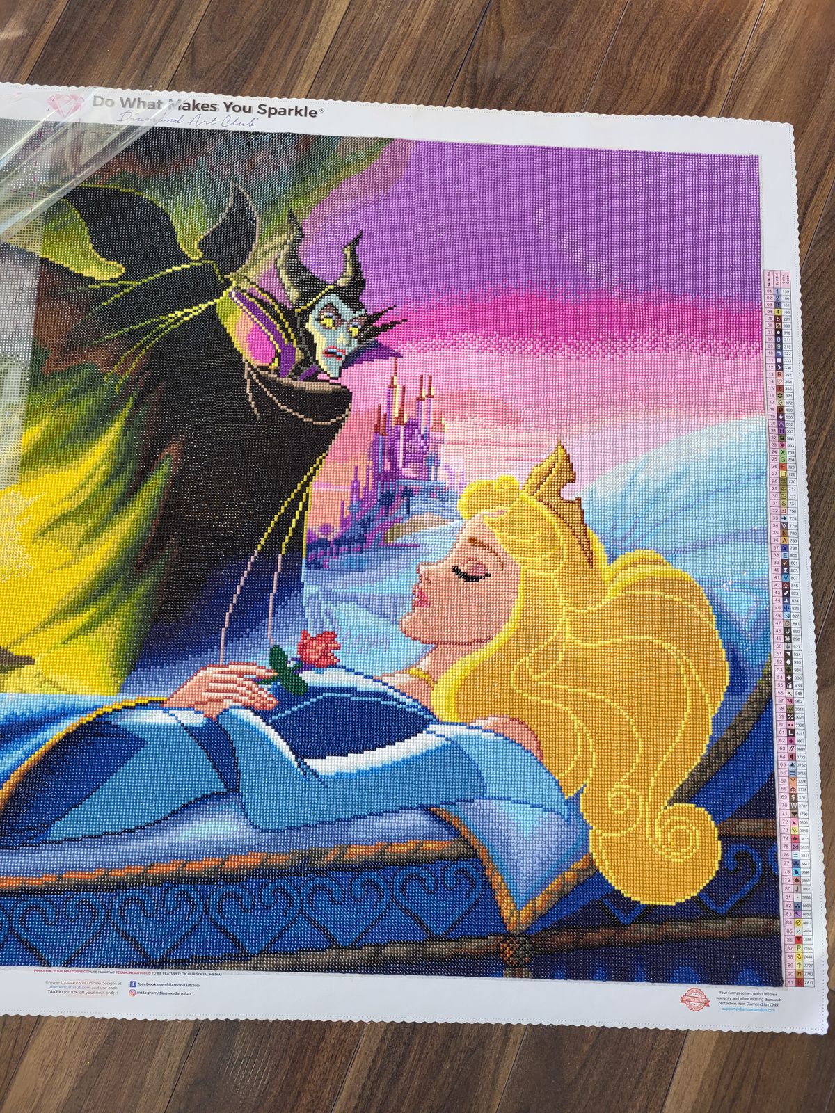 This was my first large sized canvas and I was feeling quite overwhelmed by its size and number of colors when I decided to do it. However this piece was much easier than anticipated due to color blocking and no confetti. I have about 75% of it done but want a break. This dp perfectly sums up the movie of Sleeping Beauty