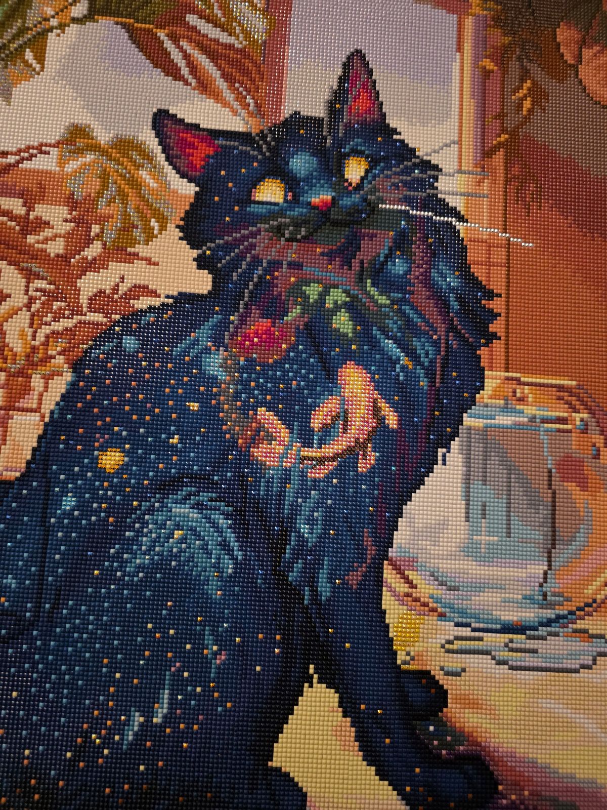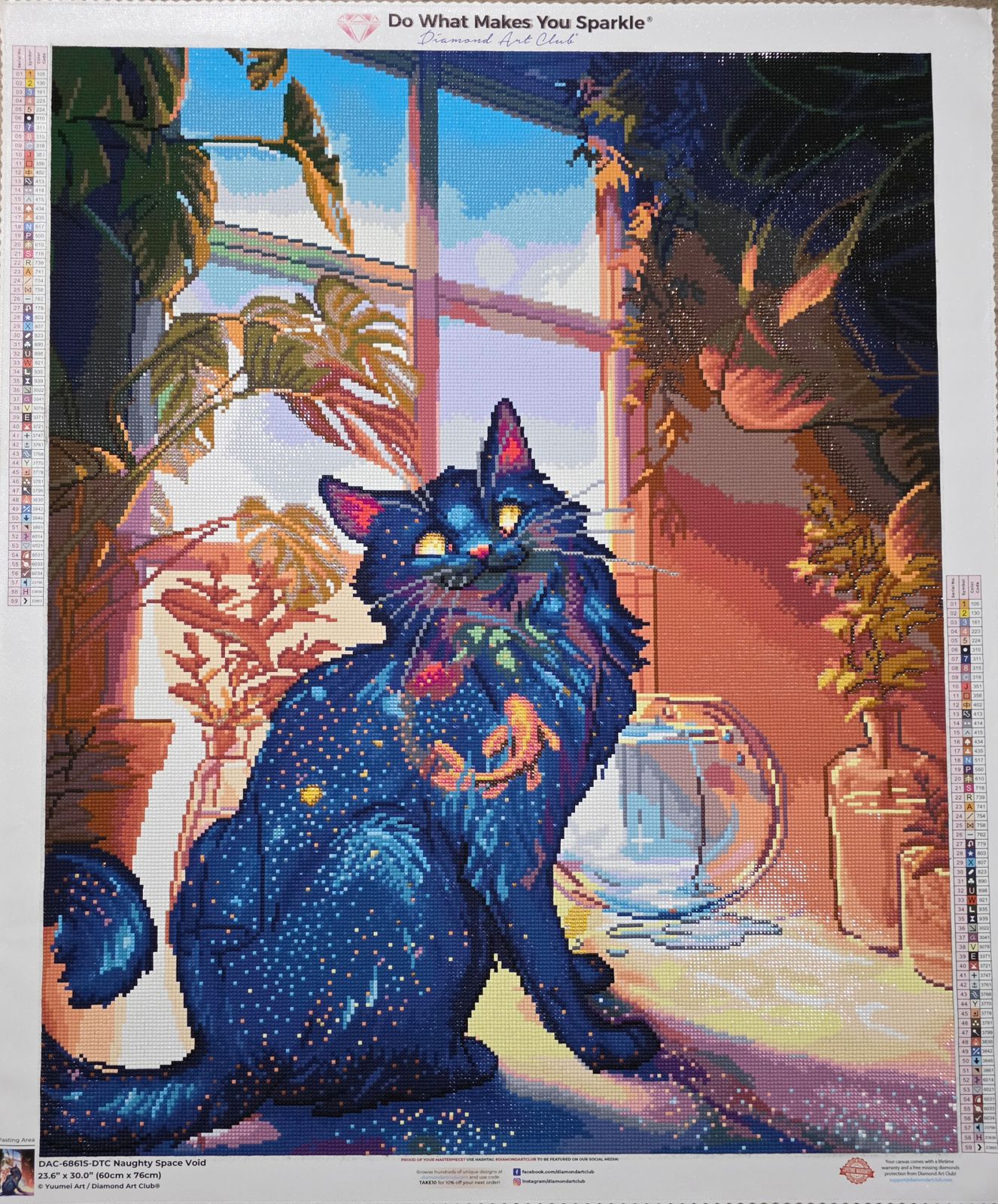 Beautiful rendering of Yuumei's art style, loved the mix of color blocking/gradient blocking background and the confetti in the kitty. I added enhancements from the drills DAC sells separately and it came out so wonderfully! I loved the colors so much, and the cat is so cute and mischievous. Loved this canvas and already started my next DAC masterpiece!