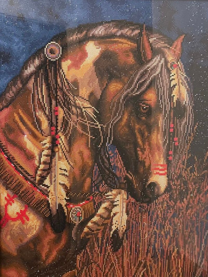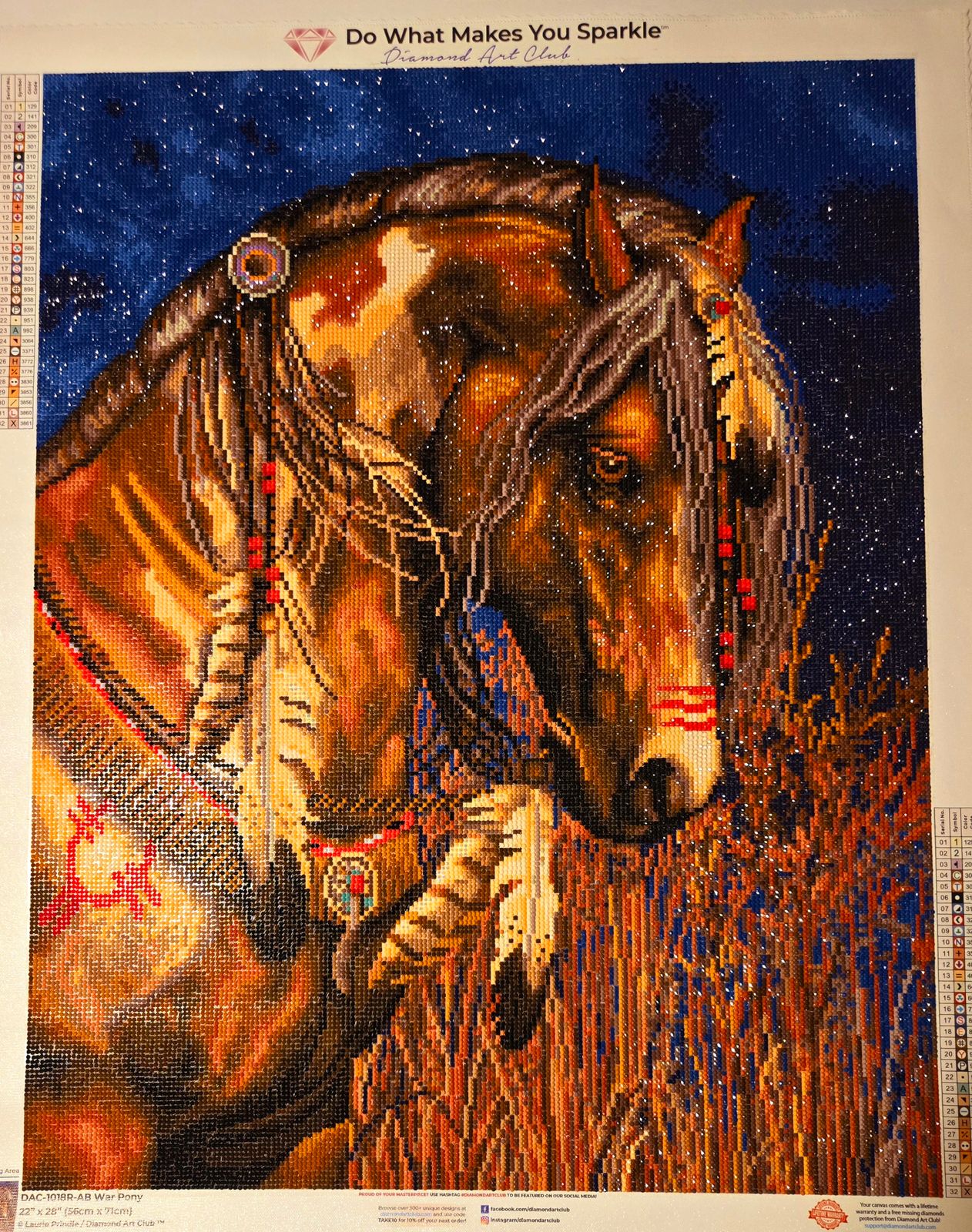 Native American tribes painted many symbols on their horses with the most common reason being for warfare. These horses would be painted before battle with symbols to make them faster, stronger, and braver. Inspired by the beautiful, colorful spirit of the Native American culture, War Pony represents wild majesty and energetic power.
