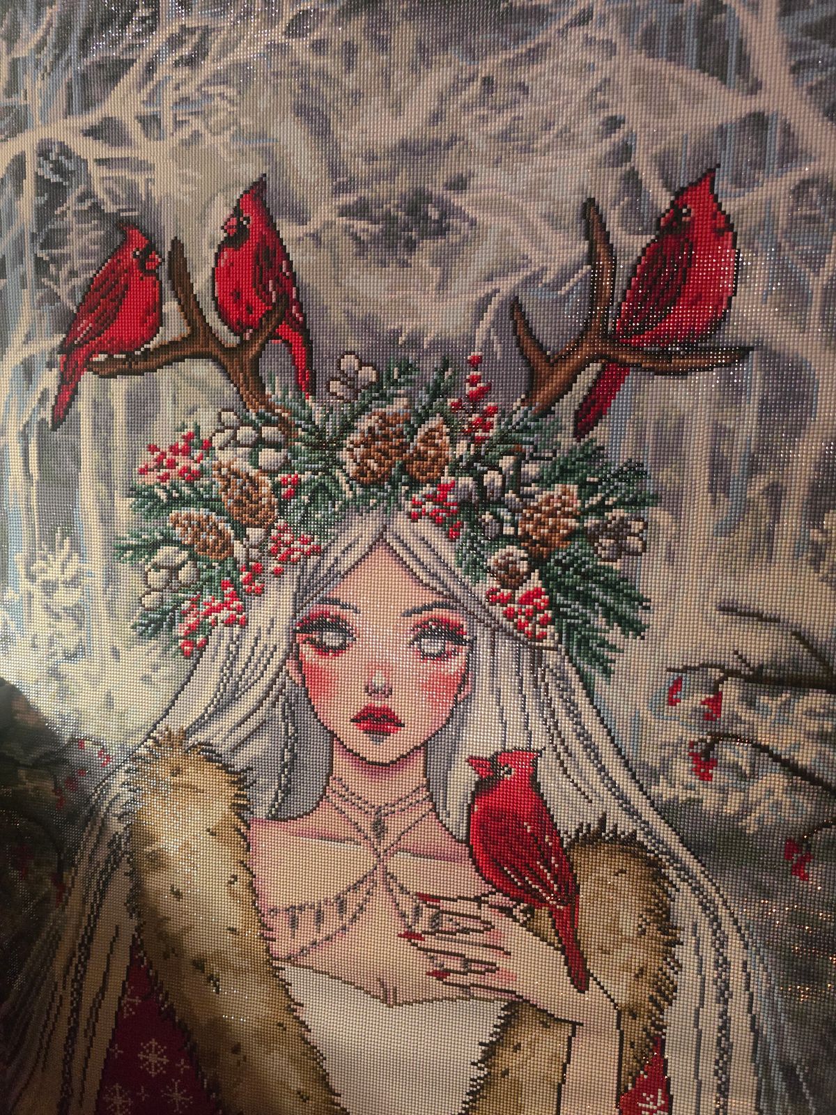 Behold the beauty of winter with this ethereal maiden, adorned with a crown of pine and accompanied by vibrant red cardinals. Her lovely grace and the frosty landscape create a captivating scene.