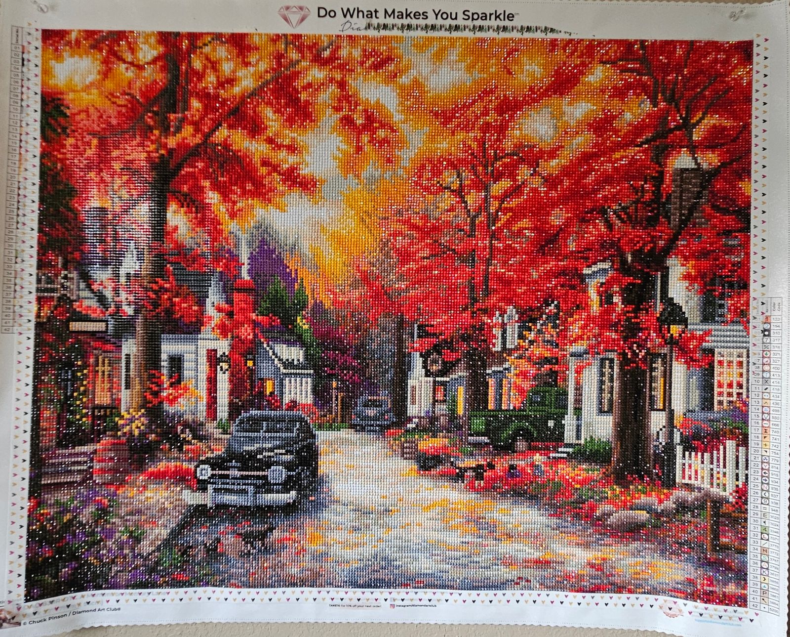 Chuck Pinson did a beautiful job creating this little street. I love the autumn vibe and the antique cars. It seemed a bit dark on the bottom half of the canvas but once you got to the trees there was a burst of color, it sparks. Highly recommend!