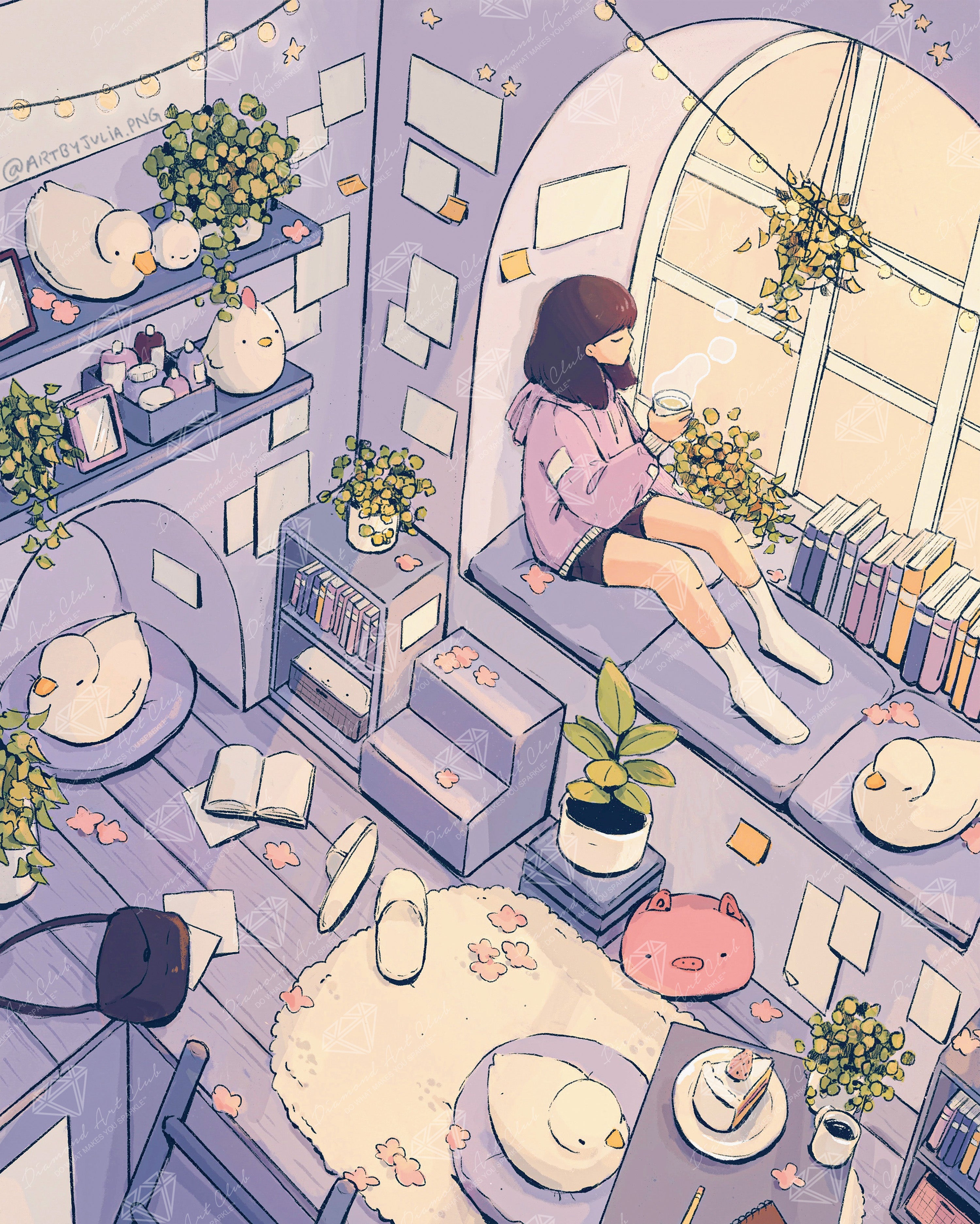 Climb up into the hush of a quiet corner, sipping your way through golden light and gentle thoughts. Books, ducks, and cake can be the coziest kind of company.