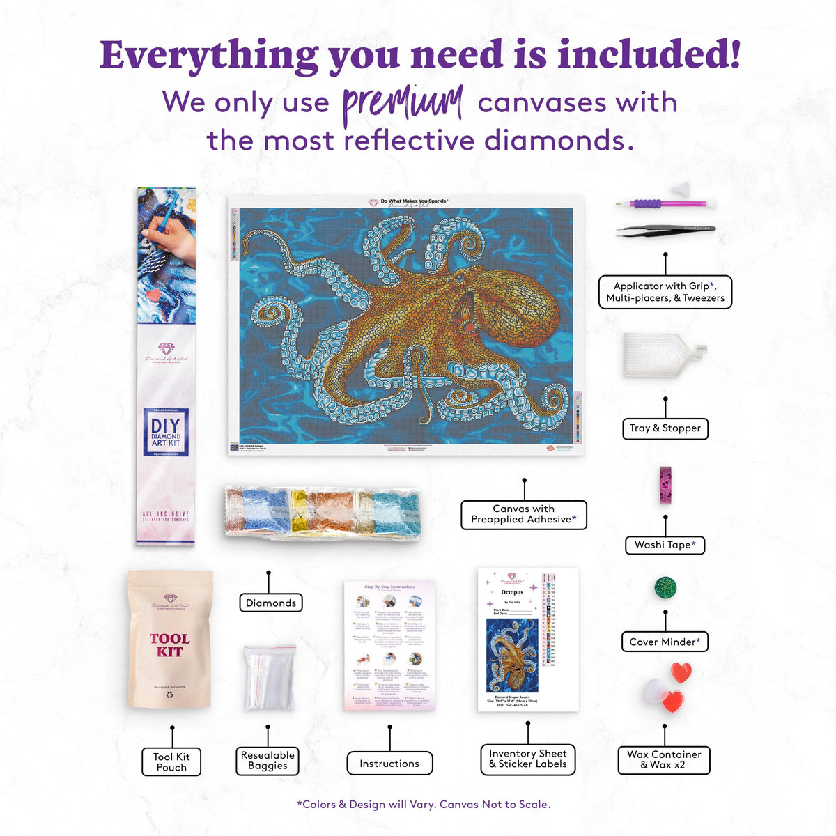 Canvas x 1, Diamonds, Tray x 1, Applicator + Grip x 1, Wax x 2, Tweezers x 1
