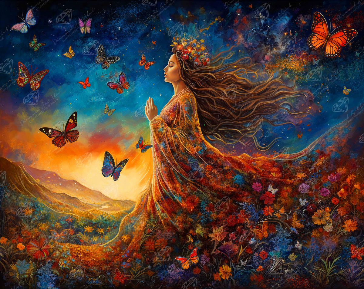 This picture is full of flying butterflies and the Praying Ladies cape is full of various flowers. The longer you view it the more you see. It’s beautiful.