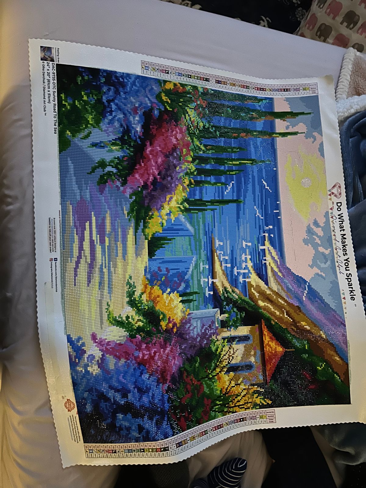 I can almost feel the sea breeze when admiring this completed diamond art. Vibrant colors and the 3 dimensional depth is amazing. 24x20- plan to try a magnetic frame! Love the Coastal/sea pictures from DAC.