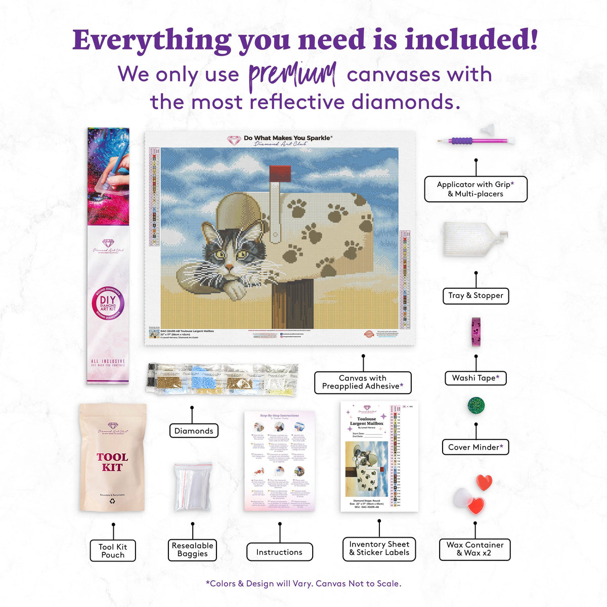 Canvas x 1, Diamonds, Tray x 1, Applicator + Grip x 1, Wax x 2