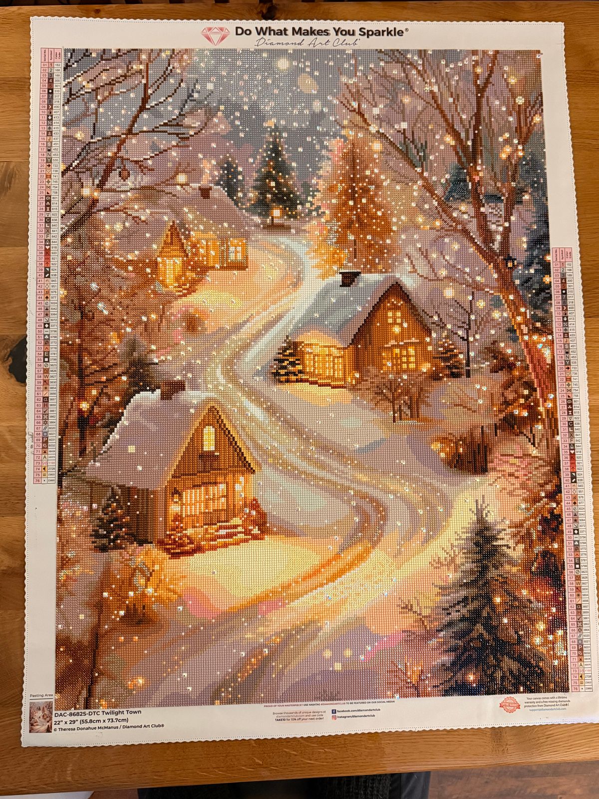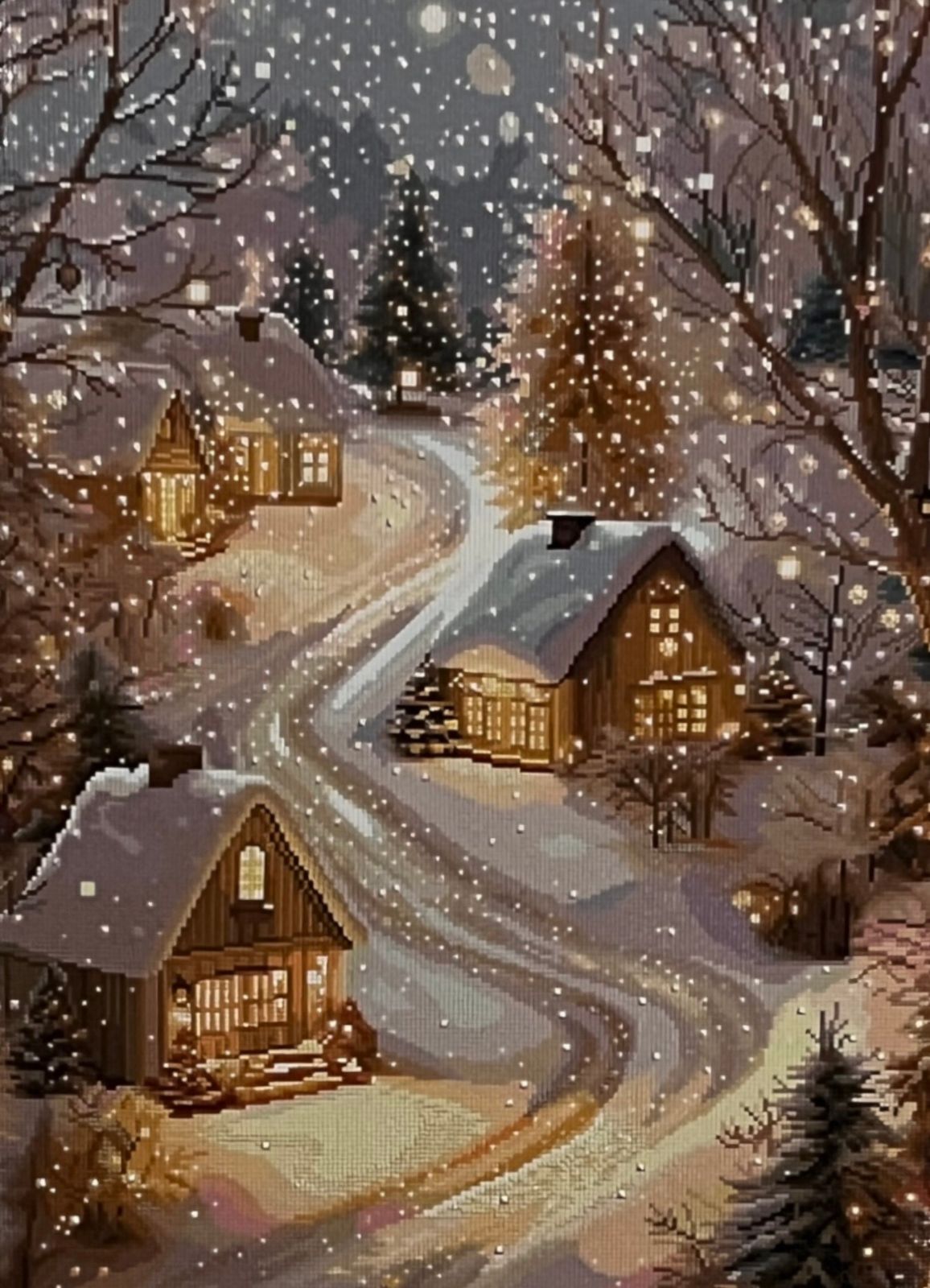 The snow reflect the glow of the cabin lights. The snow fall is blanketing the town with small and large (quad drills) snowflakes. The use of the quad drills lends a slight 3D effect showing the large snow flakes. The color pallet blends with the snow gives a warm cozy vibe. I enjoyed working with the special large size drills. The winter snowy scene is beautiful.