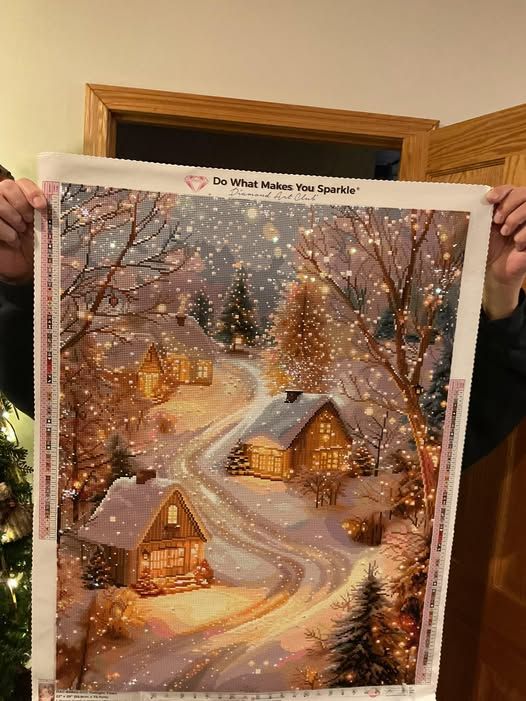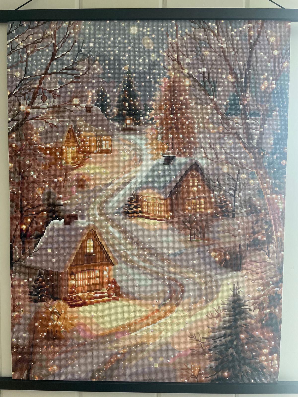 I am in LOVE with this painting! It gives me warm and cozy vibes with snow lined street and the twinkling snow. It draws me in and I can picture myself in one of the warm cabins. I was amazed on the quad drills, it gave the whole painting an ethereal glow.