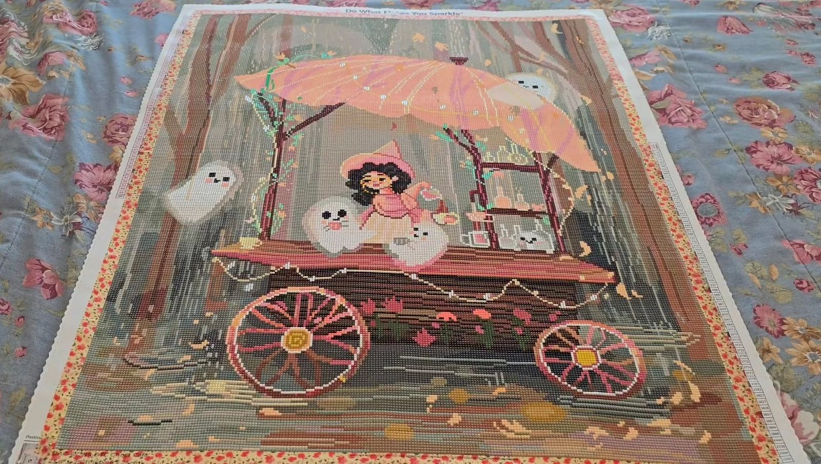 Diamond Art Club’s quality really shines: the canvas is clear and buttery soft, the symbols are easy to read, and the drills sparkle beautifully. Every section felt exciting, and watching the ghosts and café scene come to life was such a treat.