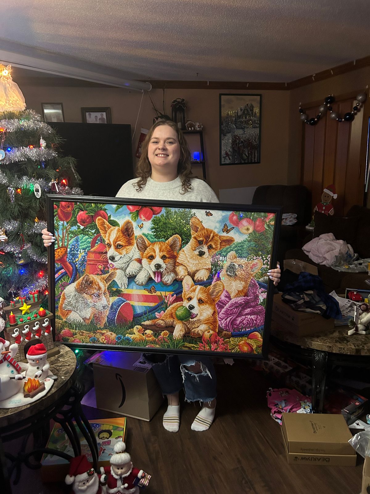 This painting is beautiful. Love the adorable little faces of each corgi puppy. Loved working on this painting and can't wait to get it framed and up on my wall.