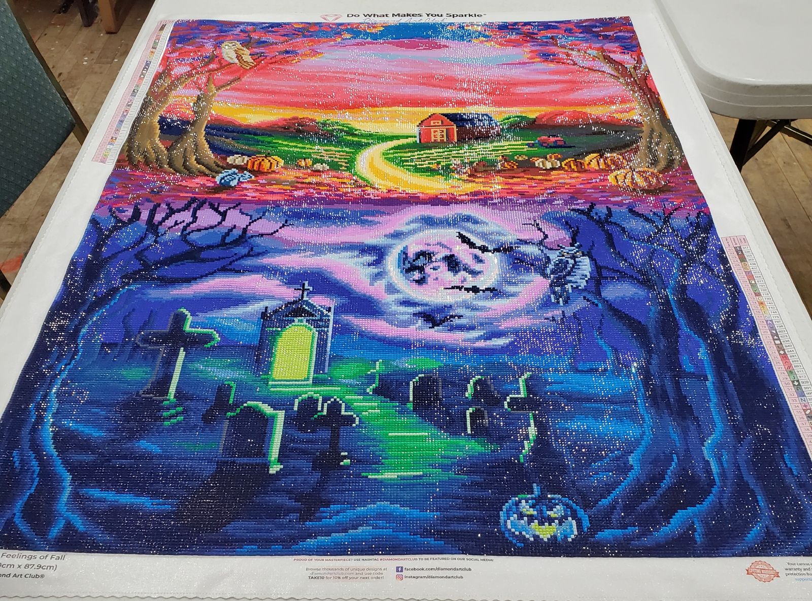 I started this piece in the fall, late for a Halloween finish, but after suffering a sudden loss in my life. I started and worked from the bottom up- the darker colors and theme down there and working through them actually did help the grieving process, plus the soothing act of diamond painting in itself.