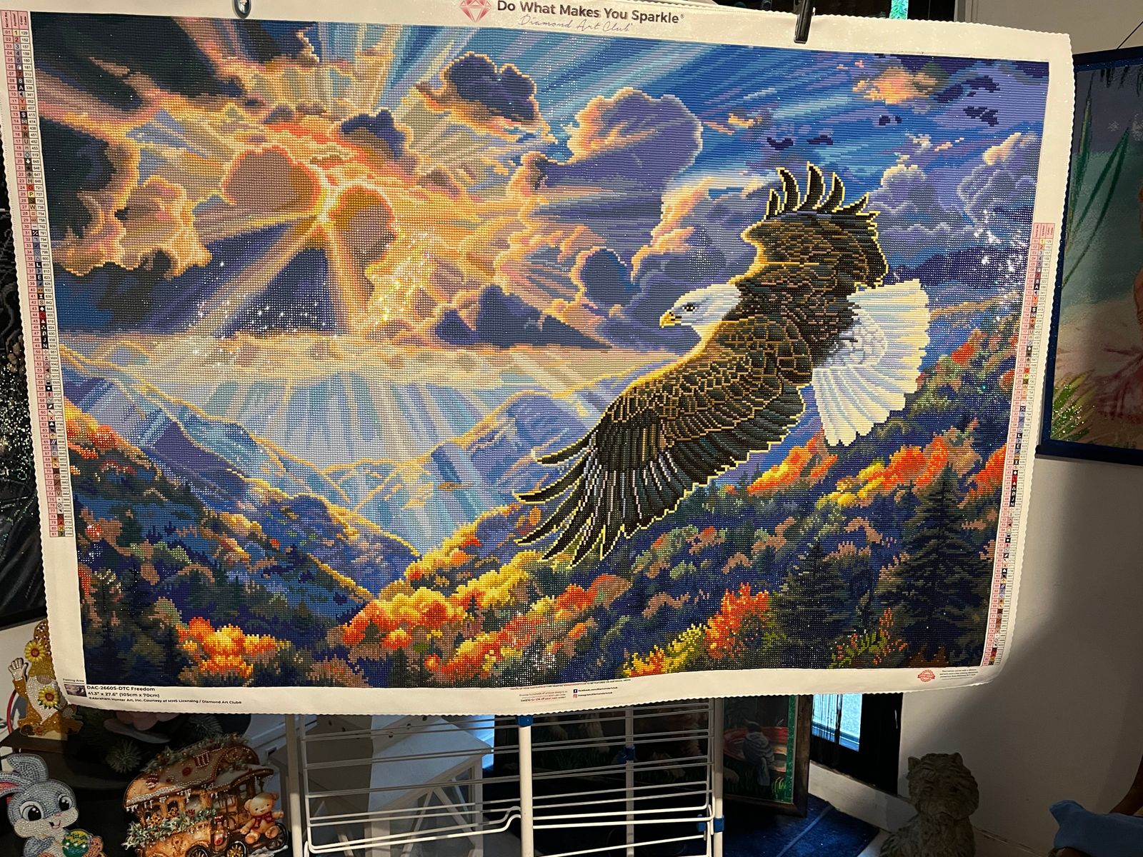 beautiful eagle flying over the trees in the fall. The sunset is showing through the clouds . It is a lovely site. I am quite anxious to start this masterpiece.