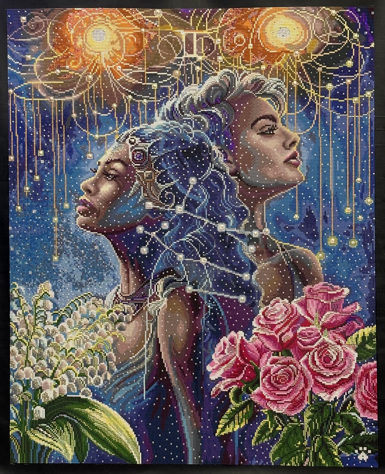This painting is a perfect representation of Gemini. The rendering is good, although I did make a few changes in some areas to make things look a little neater. I had no problem with drills, but there was a small area that had blurry symbols and the glue was not very sticky in a couple of spots. I used enhancement drills that I purchased separately to amp up the sparkle and shine of the painting. I also changed the color of the jewels in the crown because they're supposed to represent the birthstones for May and June, but the colors in the rendering don't reflect that. Overall, it's a gorgeous image and one of my favorites that I've completed.