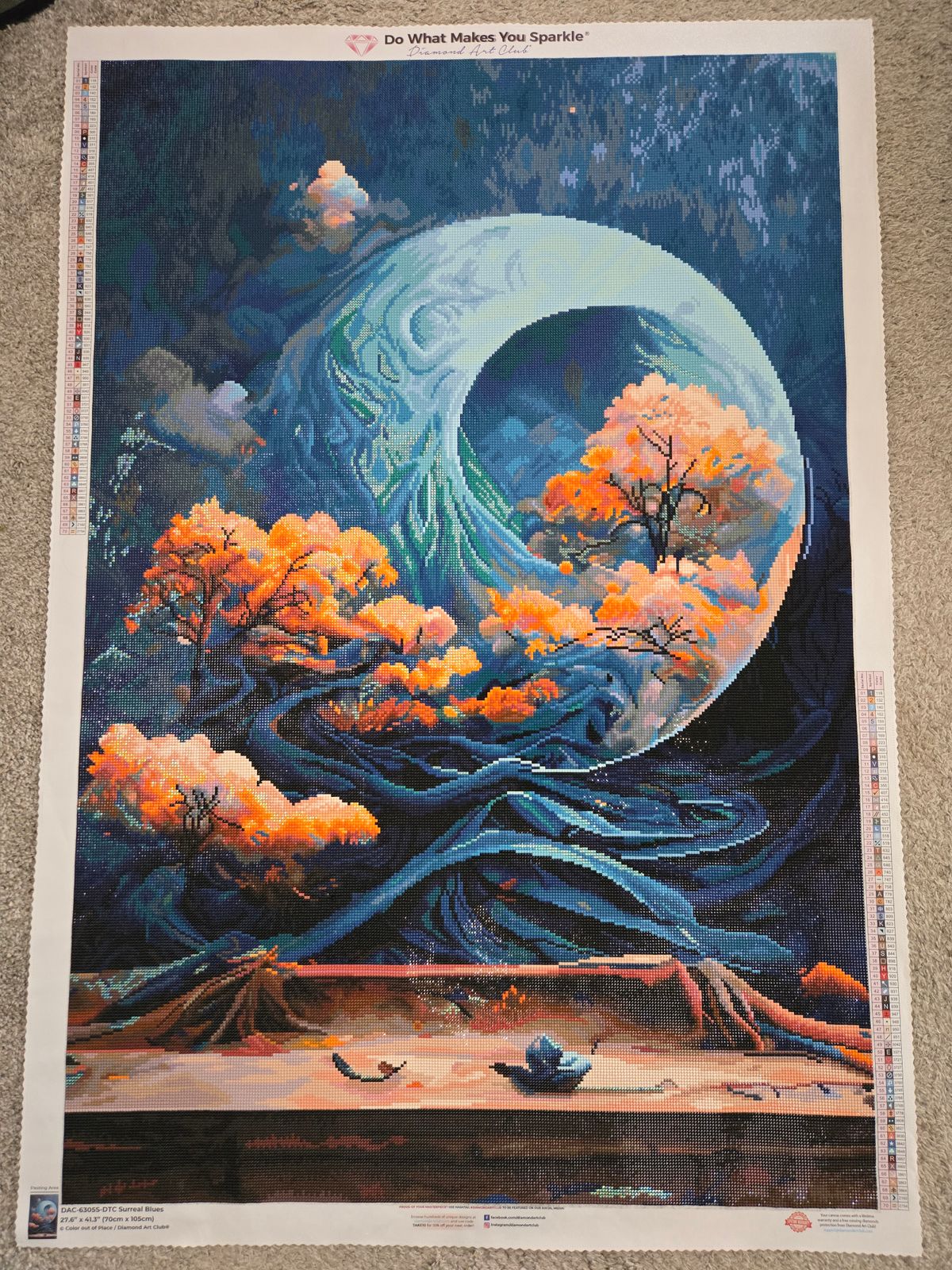 Almost halfway done and it already looks amazing. Working with all the different blues never got tedious, though to be fair, there's a lot of blue :) I feel like the contrast between the moon and the trees looks even better in person, compared to the reference picture
