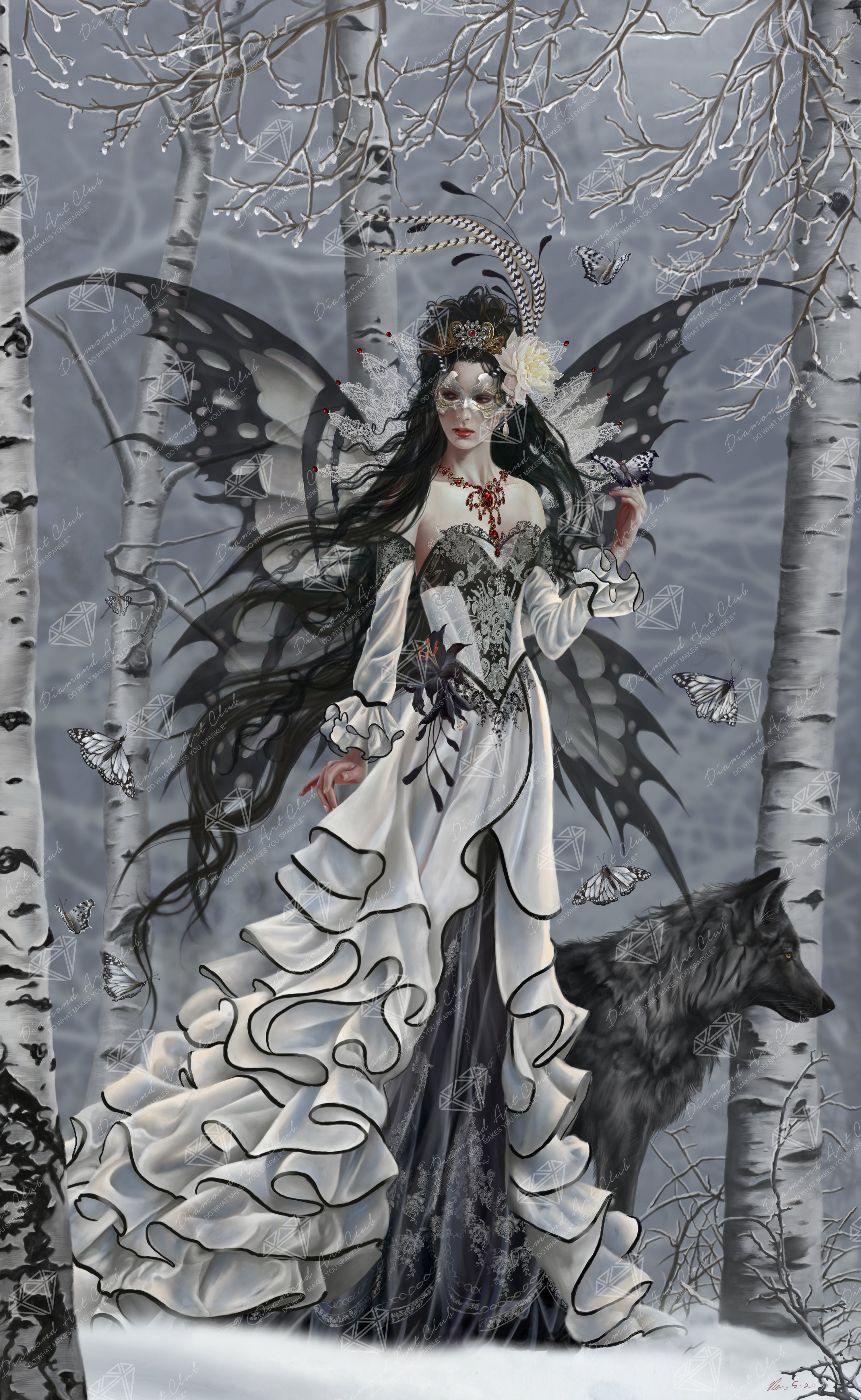 Roam the frosty forests with this mysterious queen, her intricate gown flowing as butterflies flutter amongst the birch trees. A loyal wolf by her side listens for signs of danger.