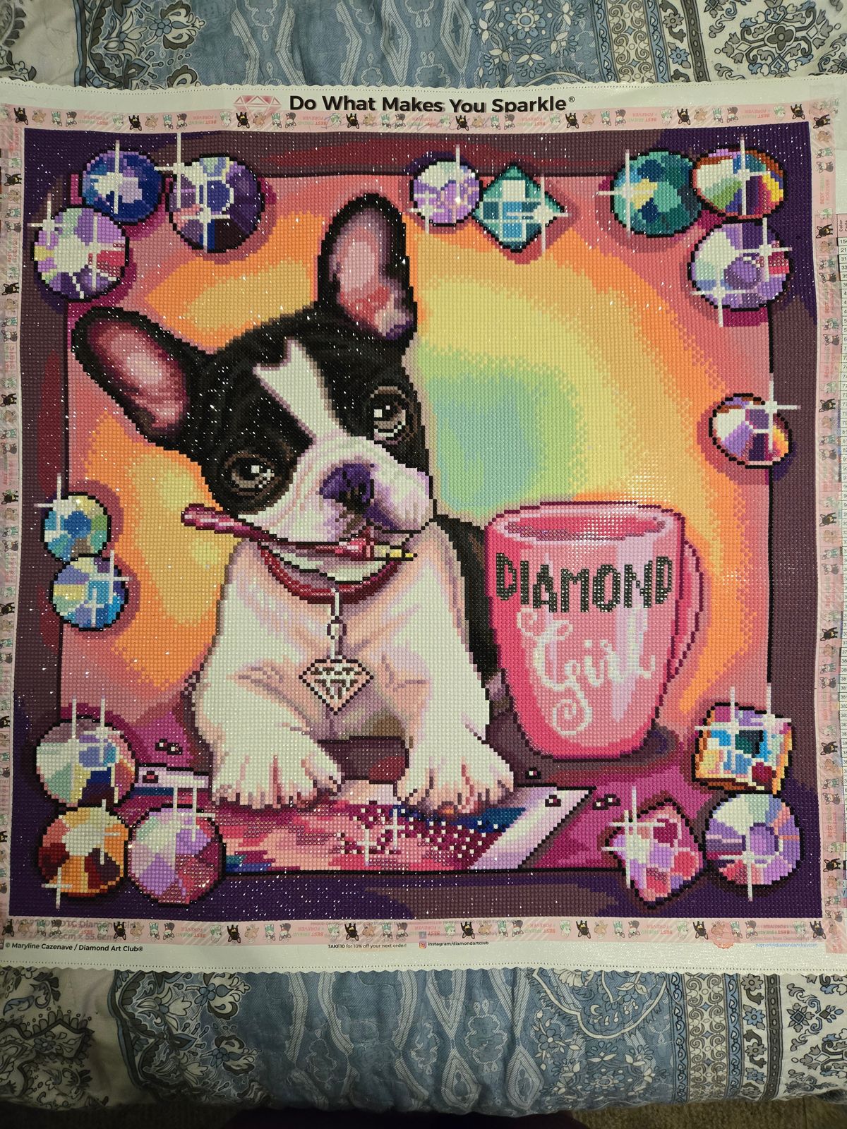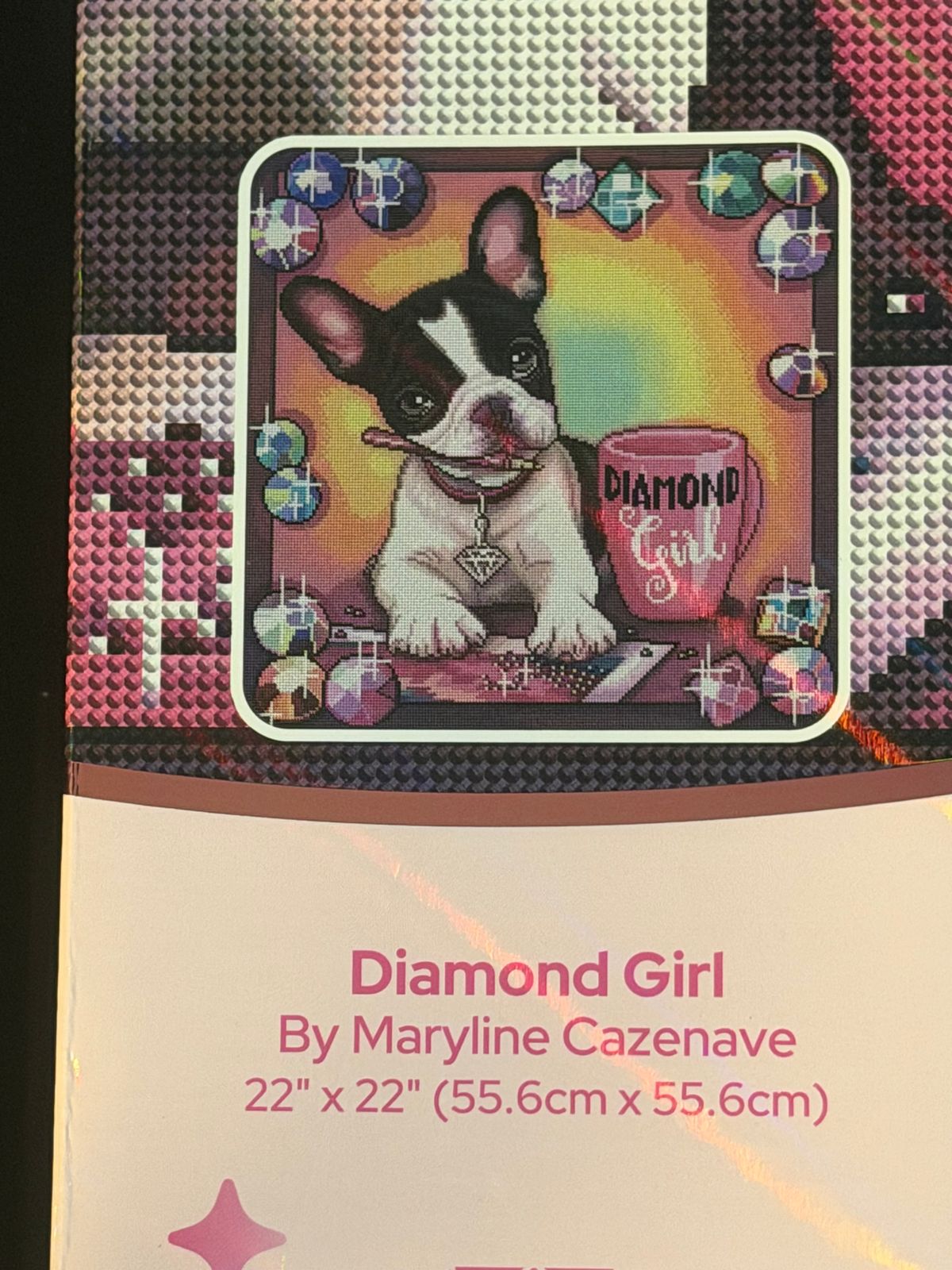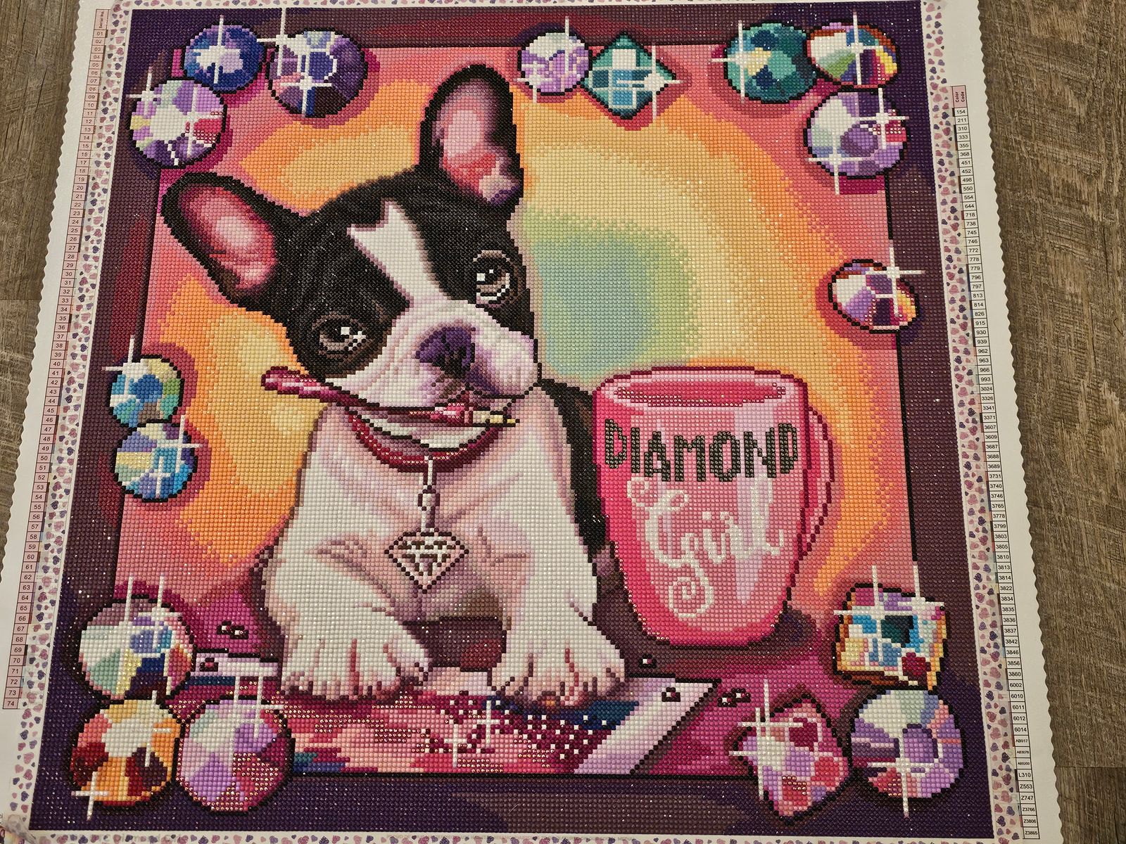 This canvas is perfect in every way. The image of a pup diamond painting is right up my alley. Plus this is the perfect medium size painting, with a great blend of confetti and color blocking that this could be a great painting for any level of diamond painter.