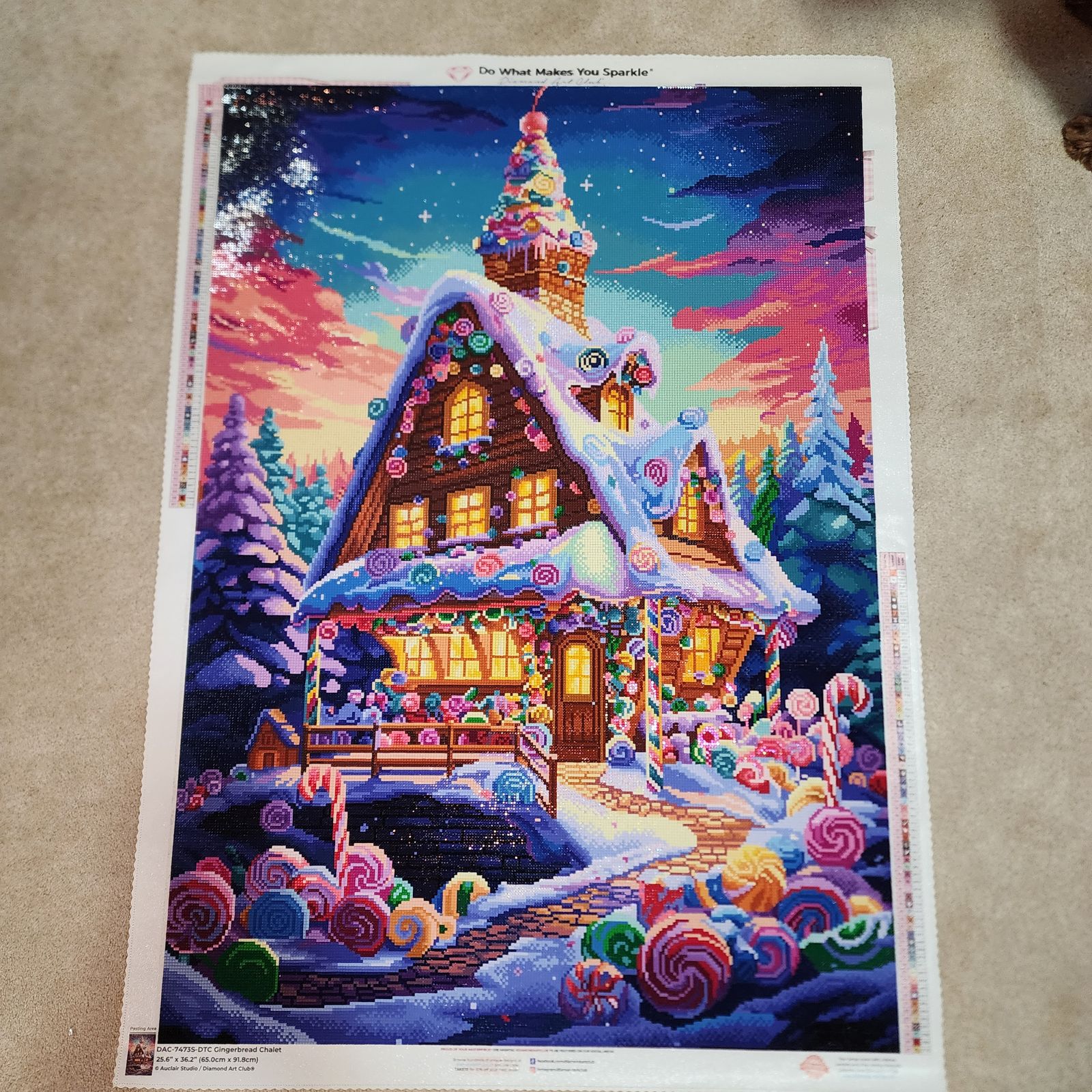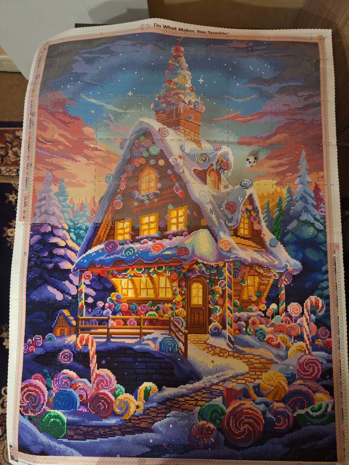 I absolutely loved doing Gingerbread Chalet. It had just the right amount of confetti. The colors are gorgeous and bright.I never got bored. Everyday I looked forward to working on it. It took me 4.5 months(just about everyday) to complete this. It is very big!!!!