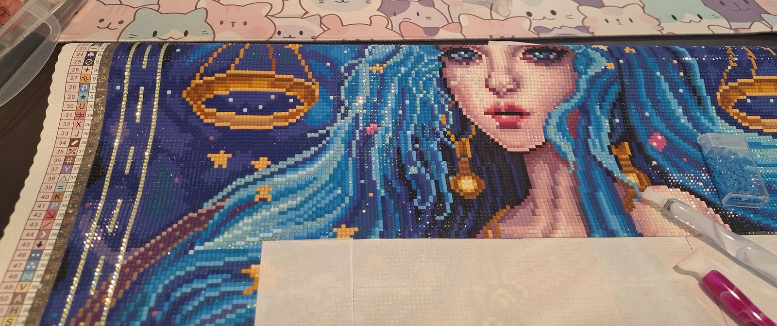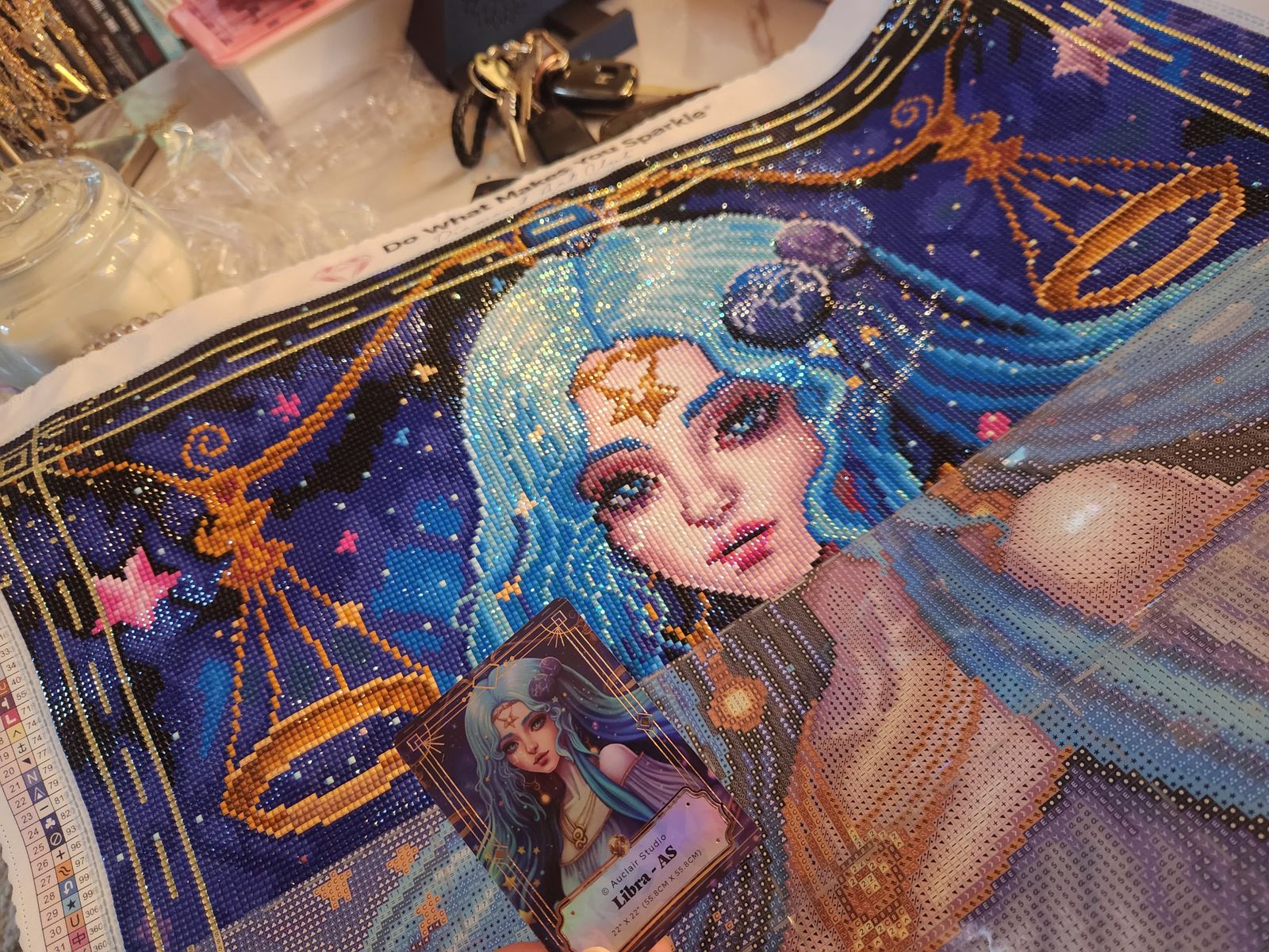 This canvas is a bit monochromatic with alot of shades of blue. But the symbols are clear to read and the end result is pleasing to the eyes. Contrary to what the site says, this kit DOES come with an iridescent drill to make the inner frame that is caracteristic of the whole astrological sign serie by Auclair Studio. Fun fact, the only canvas from this serie without iridescent drills is the Taurus canvas, and you need to keep your left over drills from 4 other similar canvas to have enough drills to give her the same sparkle than the others. So keep those L-455 drills preciously, you are gonna need them... For Taurus.