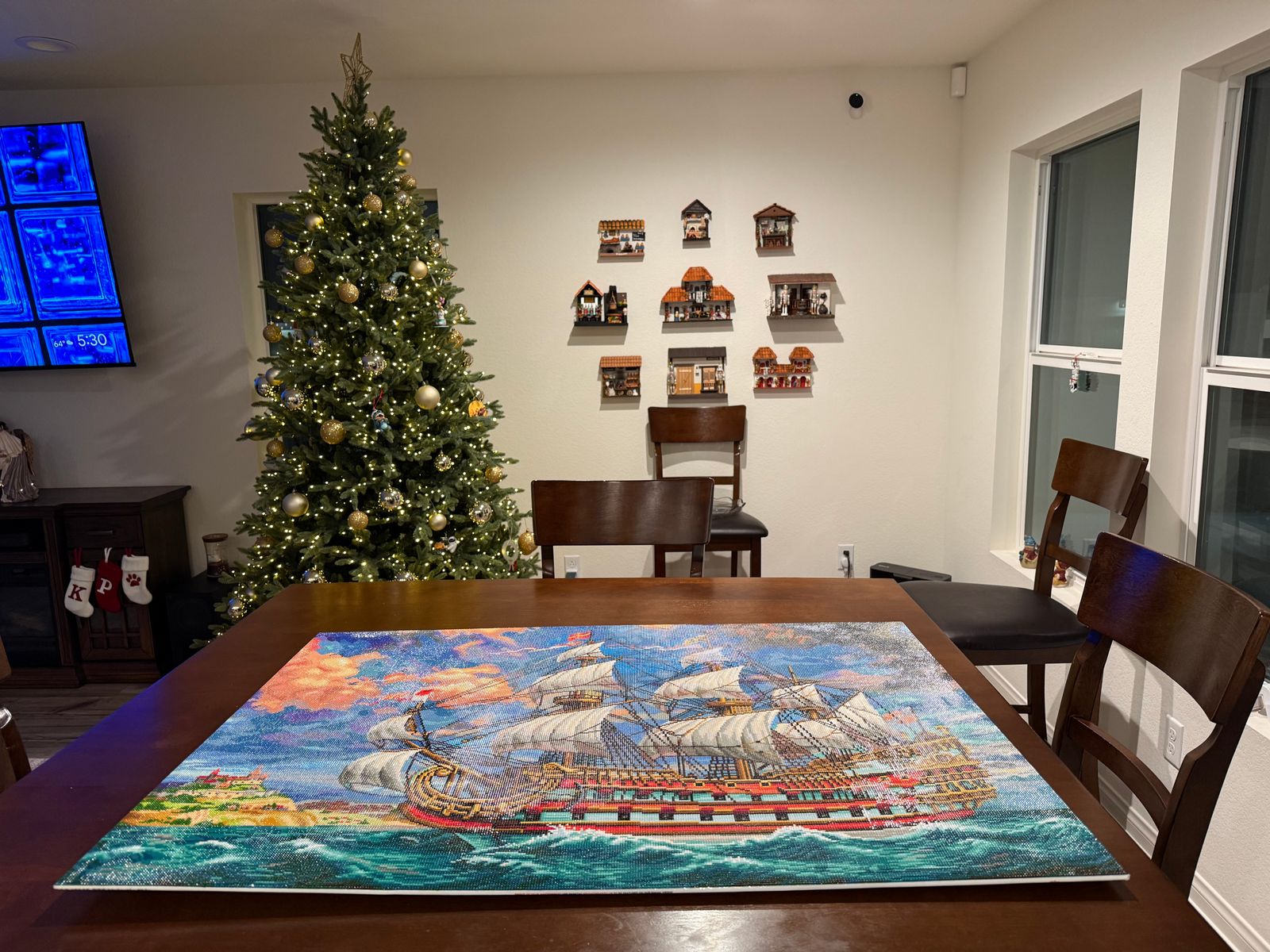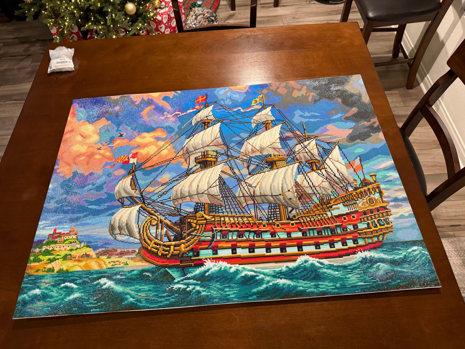 The details of the ocean and the ship are stunning! The ship looks so beautiful , sails puffed out,and on its journey 💕 this will look amazing on any ship lovers wall!