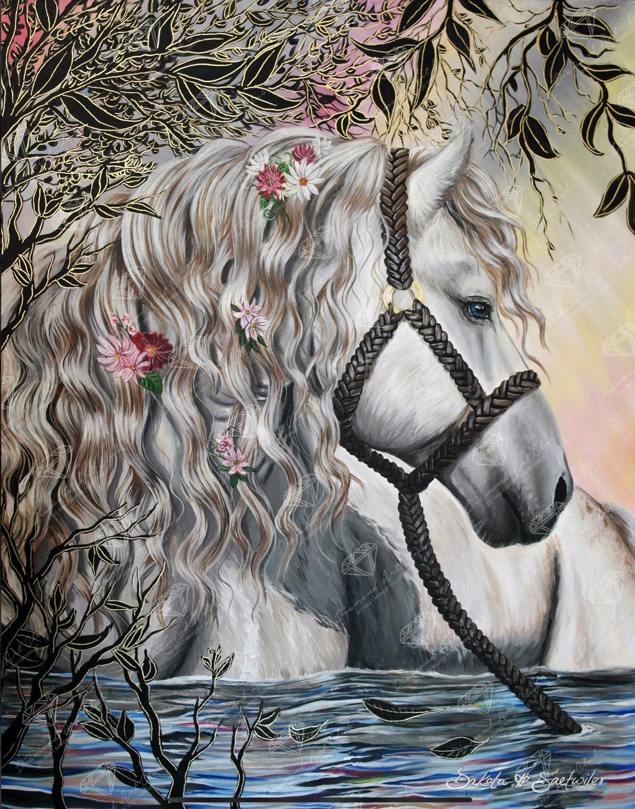 Let the waters guide you through silhouetted vines into a pastel-colored sky. Experience the feeling of wildflowers gently falling through your ivory mane as you pass.
