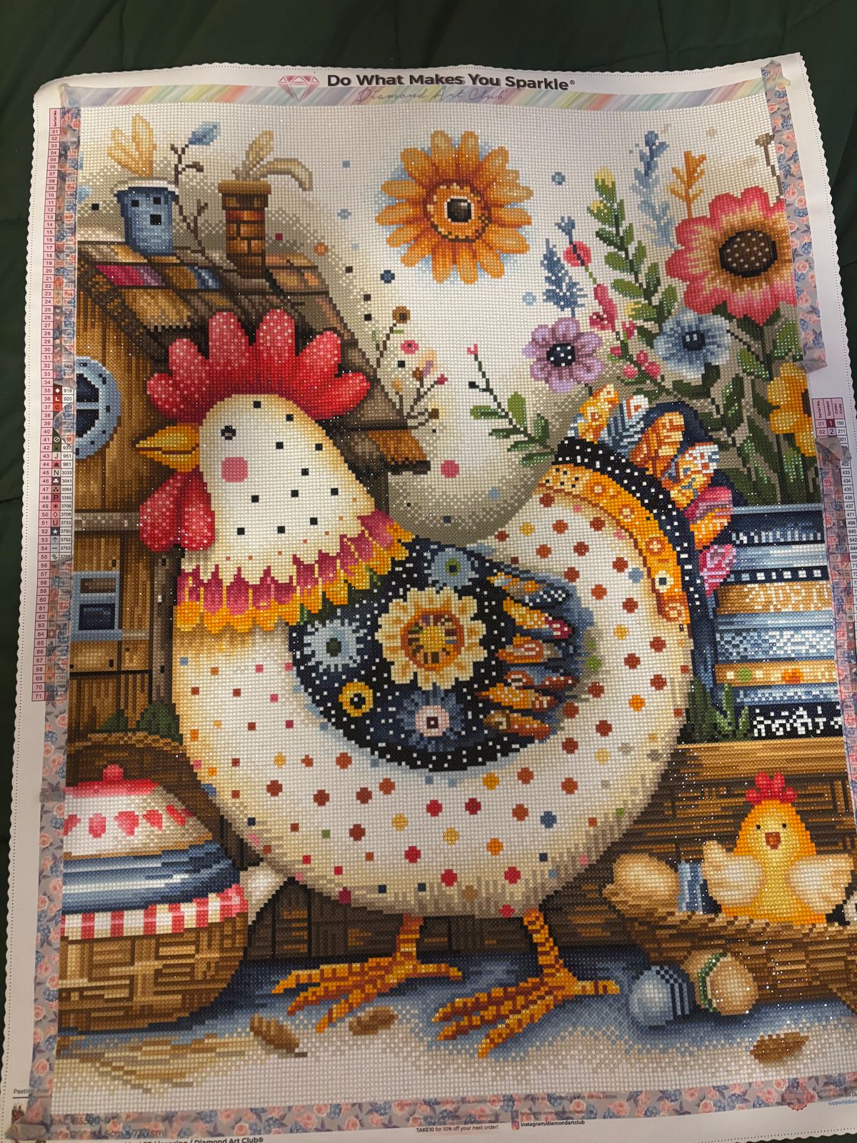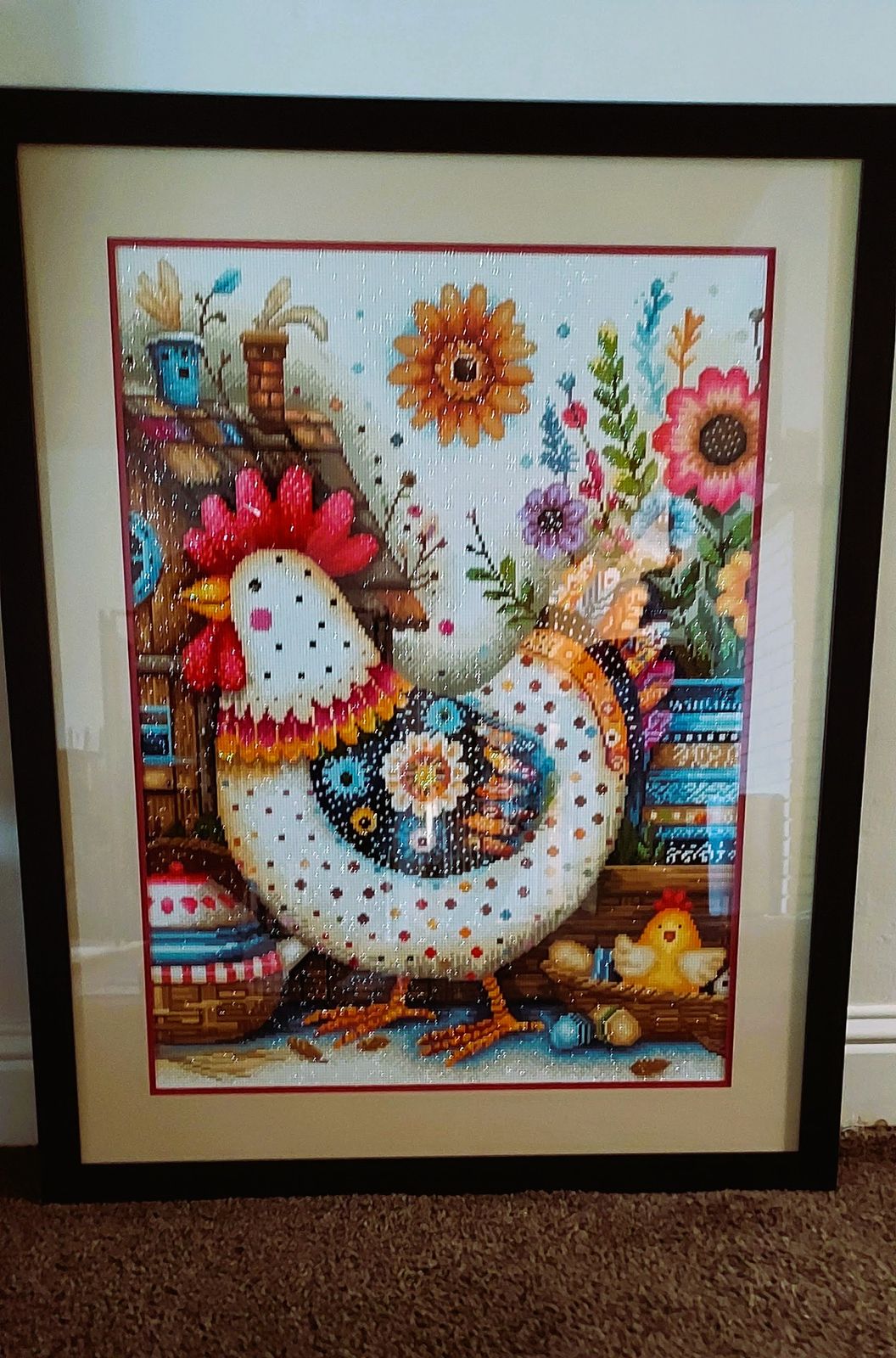 I made this canvas for our daughter who loves chickens. I had it framed at Hobby Lobby. It turned out so beautiful, I had trouble giving it away! It sparkles so much and has so many beautiful colors that it was a joy to make!!!