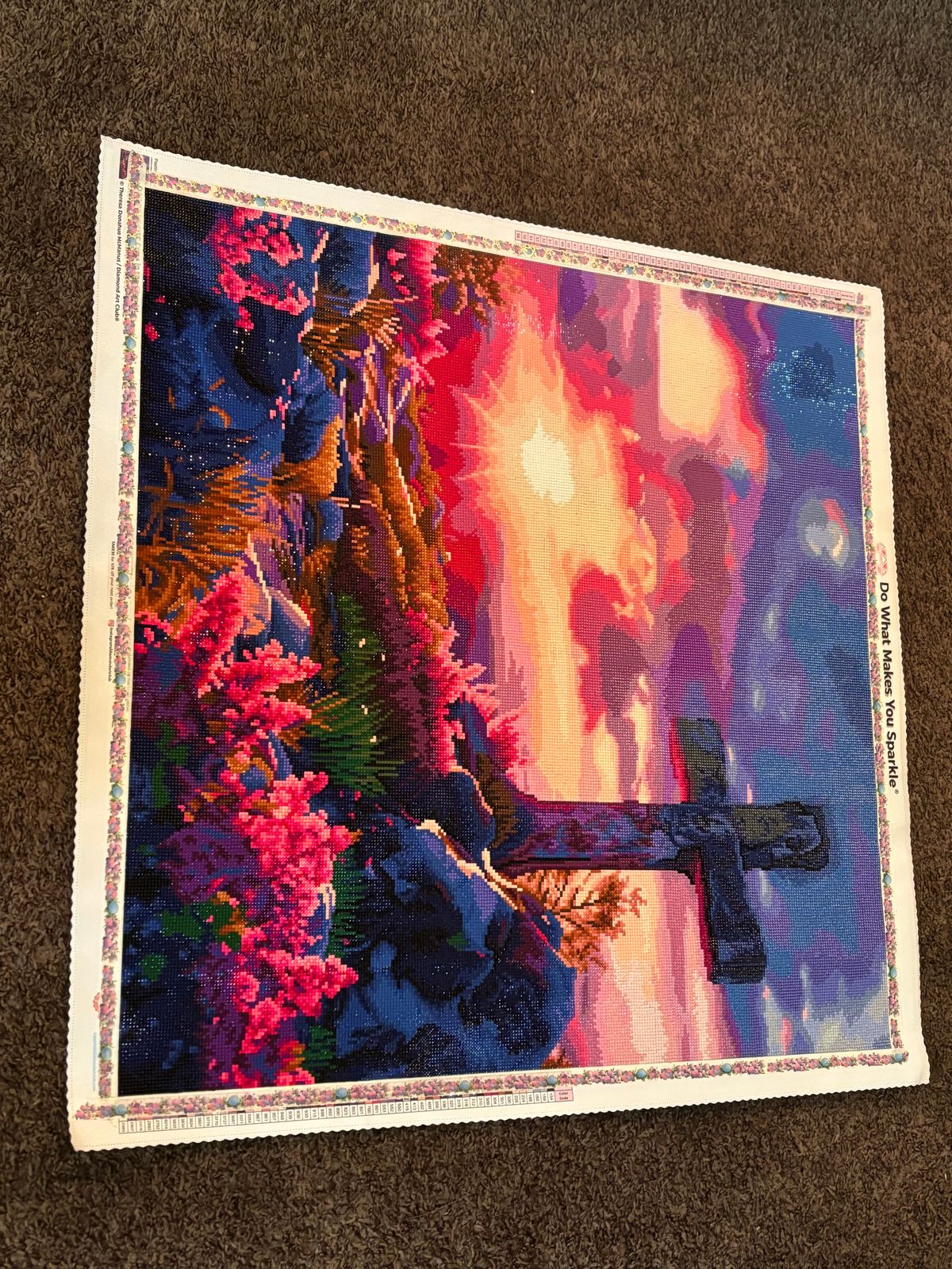 Working on Cross in the Clouds was a truly calming and meaningful experience. The design is beautifully composed with soft ethereal clouds surrounding a radiant cross that seems to go with divine light. The color palette is soothing, gentle hues of purples and pinks that create a peaceful and heavenly atmosphere. The diamond placement was smooth and satisfying, and the final result sparkles beautifully under light.