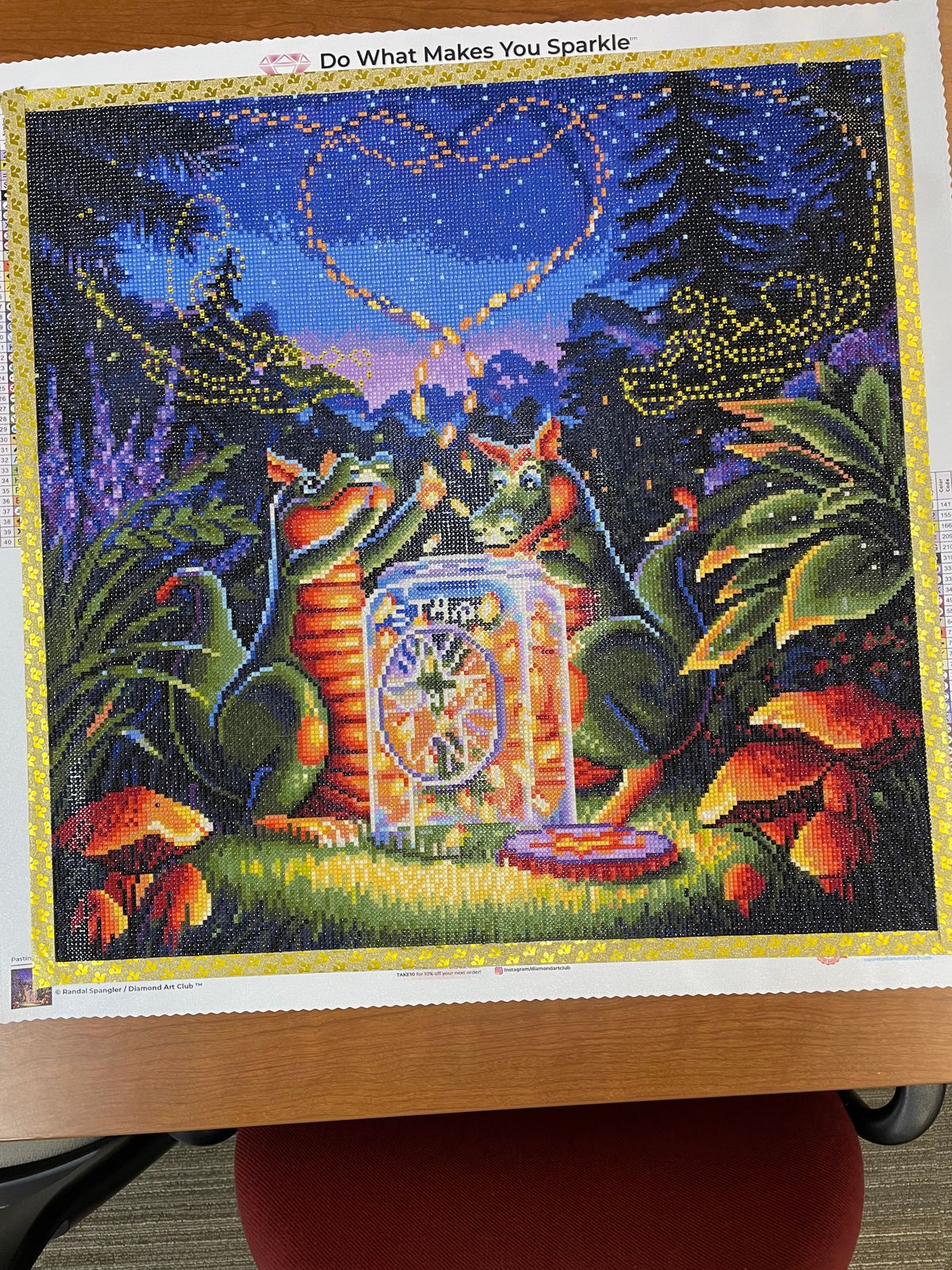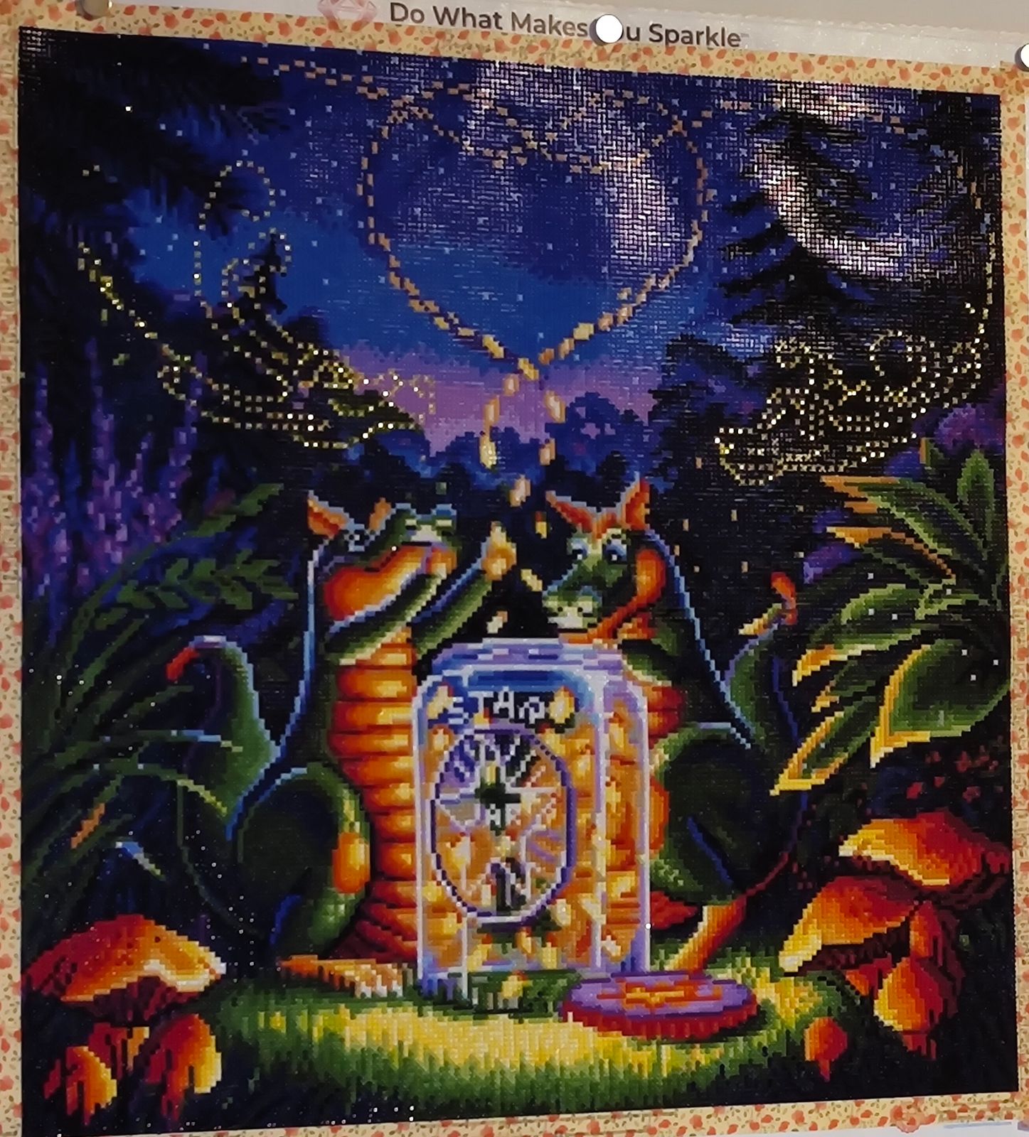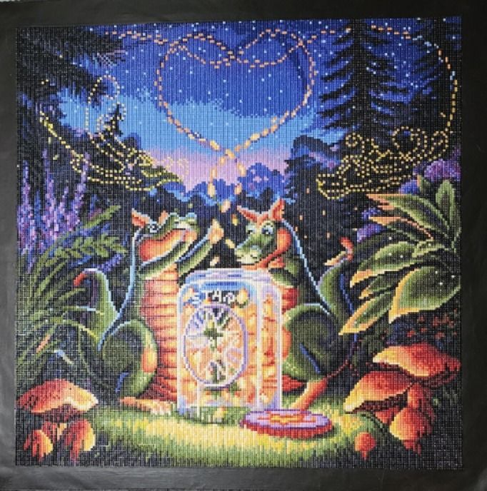 Round picture are a bit faster than square kits. I really enjoyed working on this piece with its vibrant colours. The contrast between blue night and orange mushrooms and of course the star jar is amazing. The special drills of the two misty dragons add a little extra sparkle. Love it!