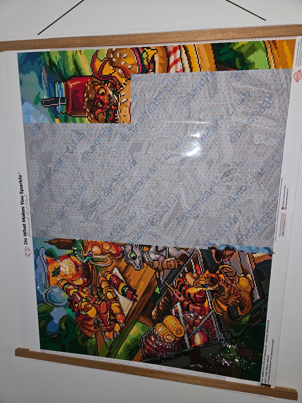 This kit was my first mystery ever. It was so fun to complete and I did not have difficulties placing even with no image. The surprise element of mystery kits makes diamond painting each section more exciting. I loved how colorful it was and how adorable the characters were. The only issue I had were several drills that were slanted throughout certain colors but I enjoyed working with the AB drills and the light brown colors throughout the painting.