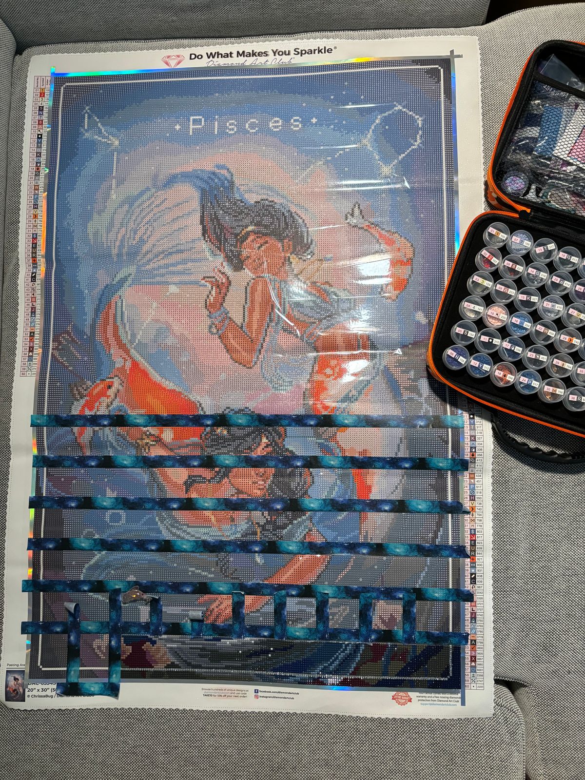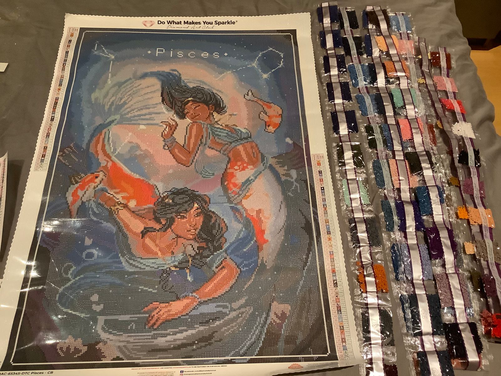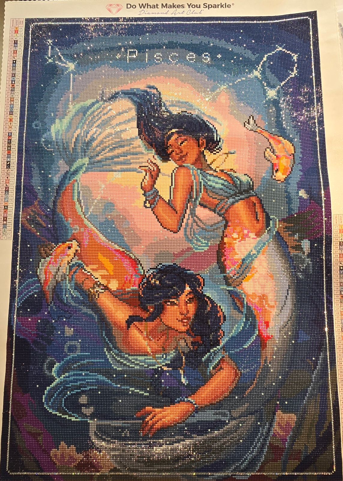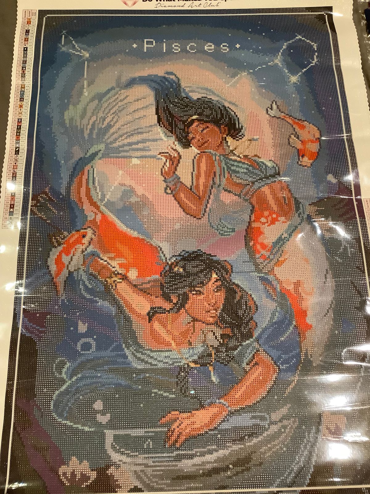 I loved worked on my zodiac sign art done by one of my favorite artists. The iridescent drills for the border and for the Pisces at the top of the canvas really make the art sparkle more.