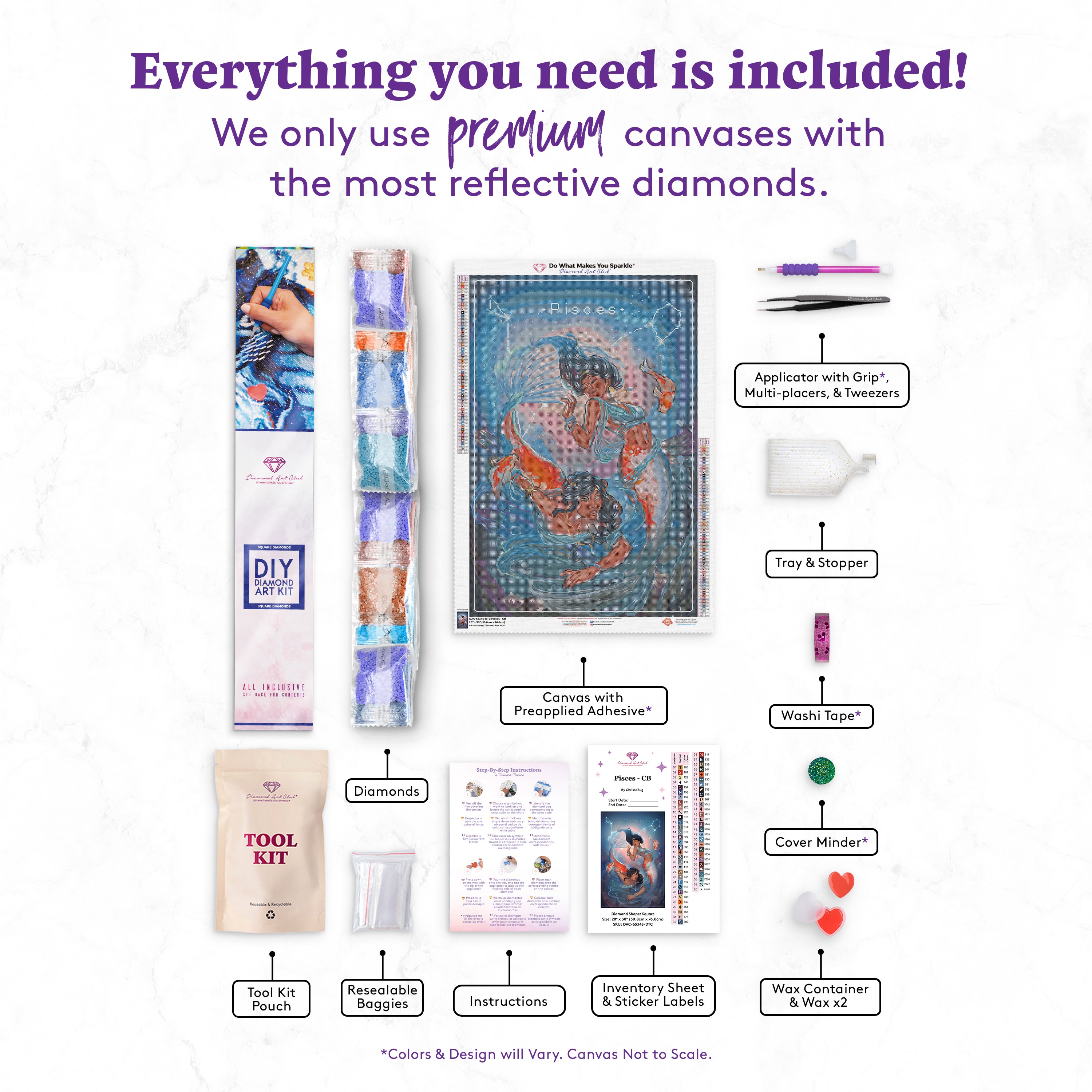 Canvas x 1, Diamonds, Tray x 1, Applicator + Grip x 1, Wax x 2, Tweezers x 1