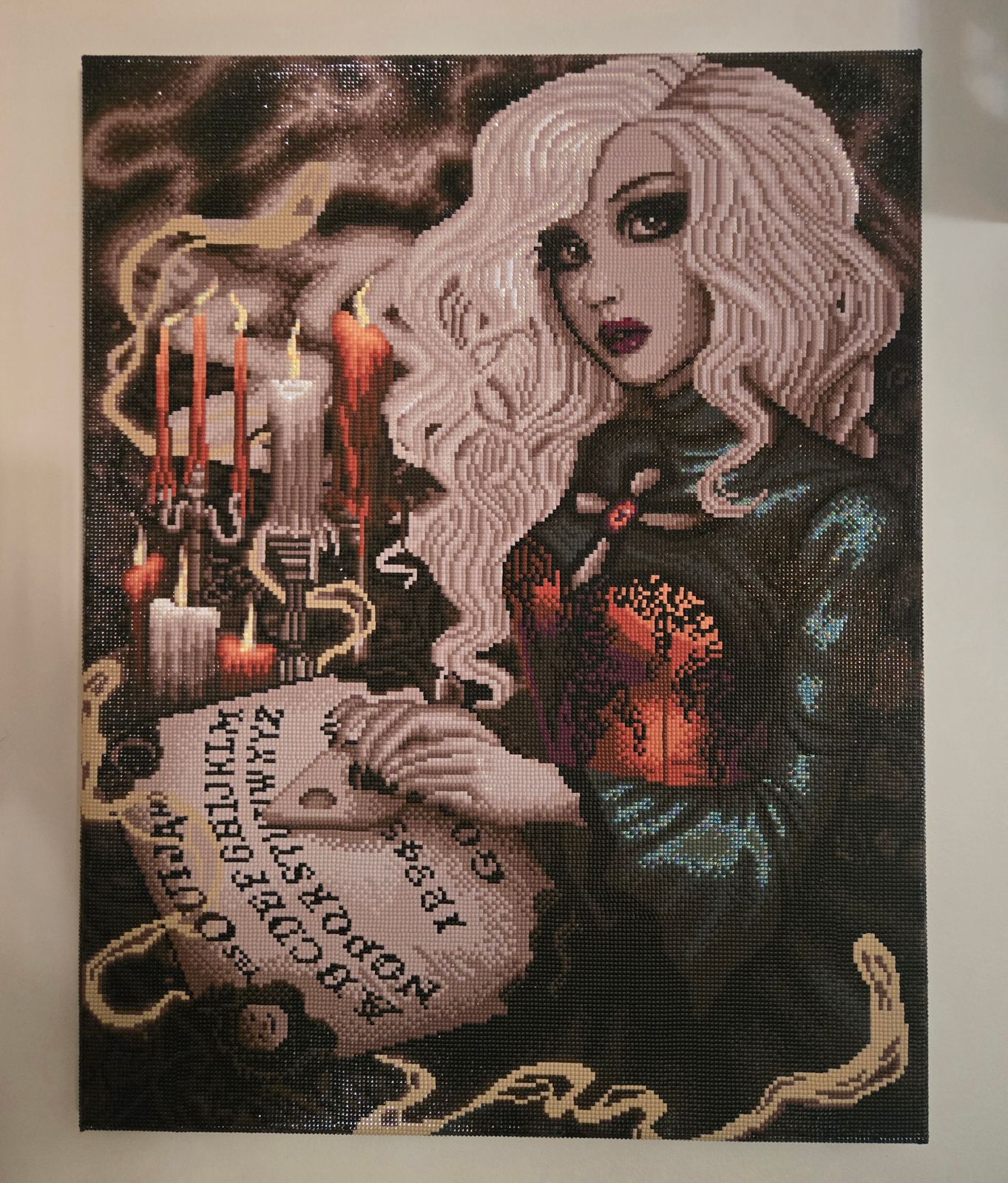 Took about 2 1/2 weeks to finish, but worth every minute. Shiny highlights on candles and sleeves are amazing.