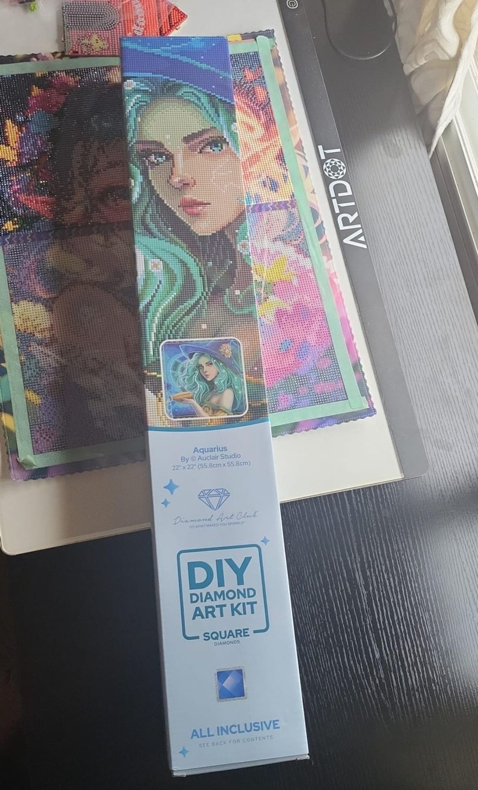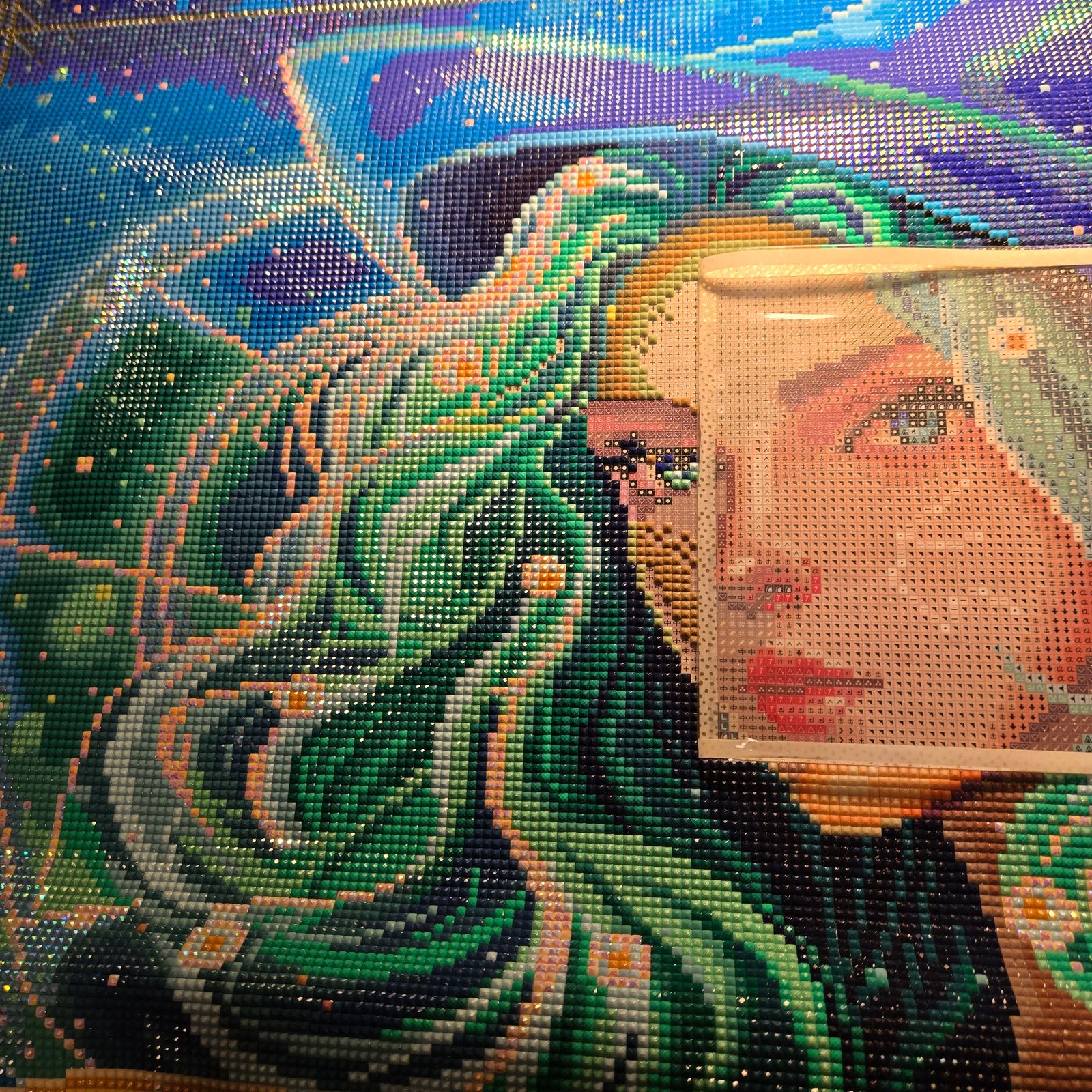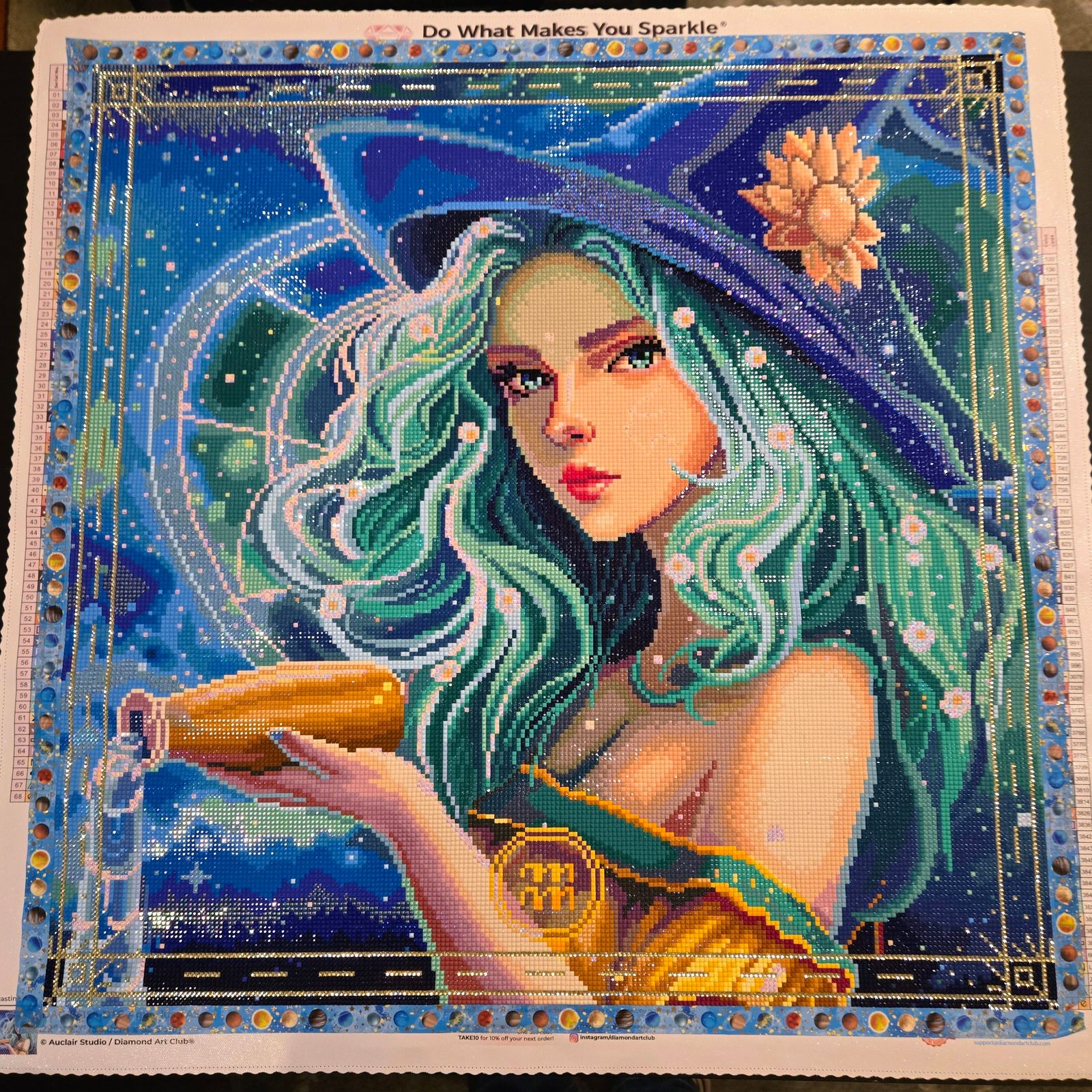 This painting is full of beautiful blues and teals. I love the gold crystals that are around the border. This girl is so pretty and I can’t wait to bring her face to life! Lots of special diamonds.