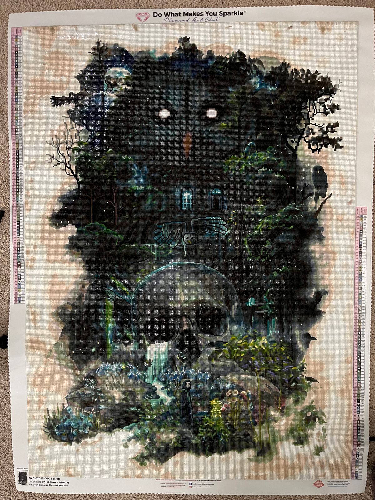 The upper part of the painting, especially the large owl’s head and the small owl, really tested my patience. The colors were extremely dark, and working on it was truly challenging. You wouldn’t believe it, but the painting uses a total of 90 colors! You wouldn’t notice that at first glance, but it becomes obvious with all the tiny confetti areas, mostly made up of shades of gray, blue, brown, and green. Despite the difficulty, I just couldn’t stop working on it and kept going. Something about this piece completely drew me in and kept me motivated to see it through.