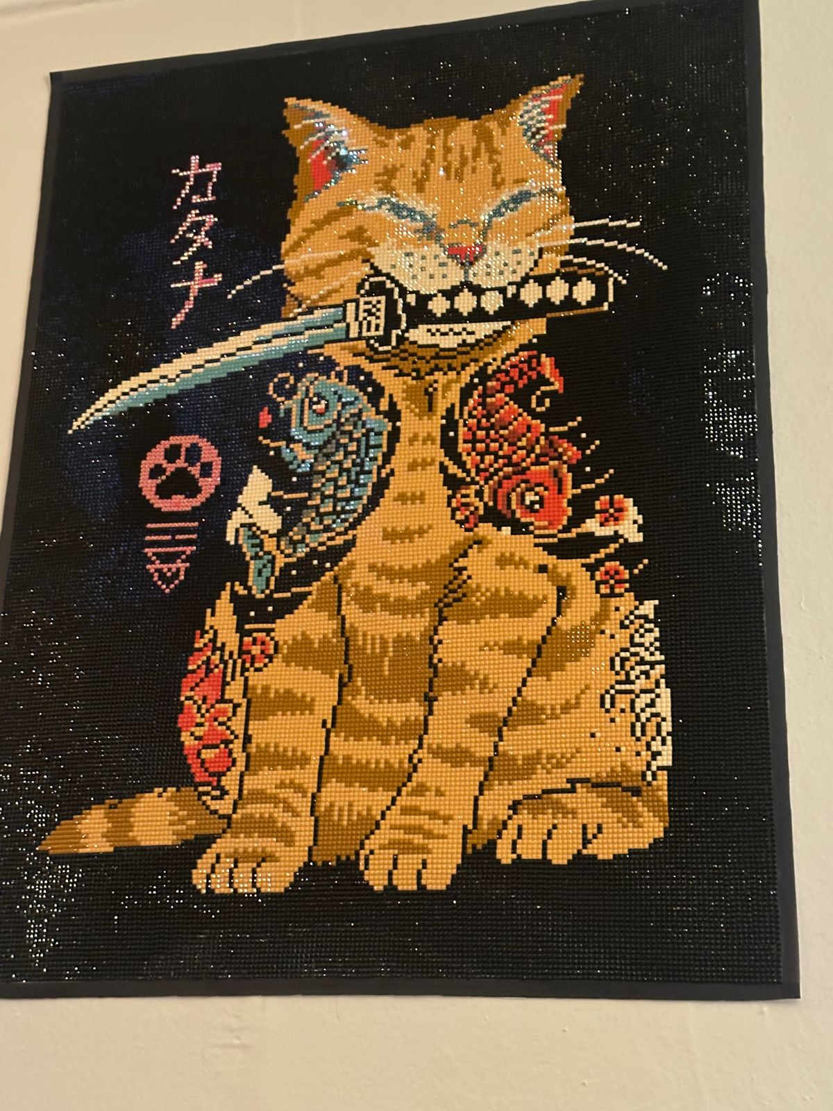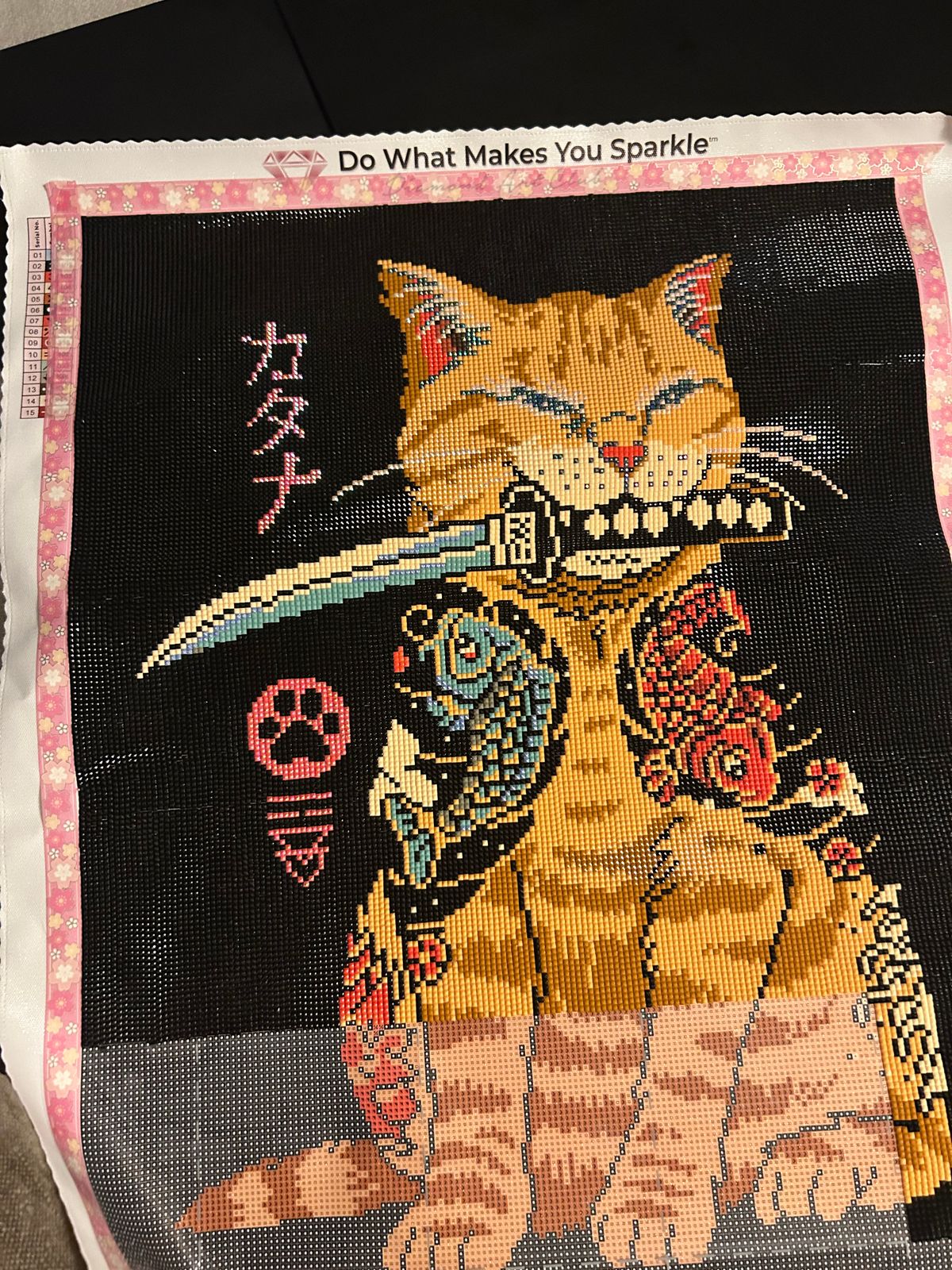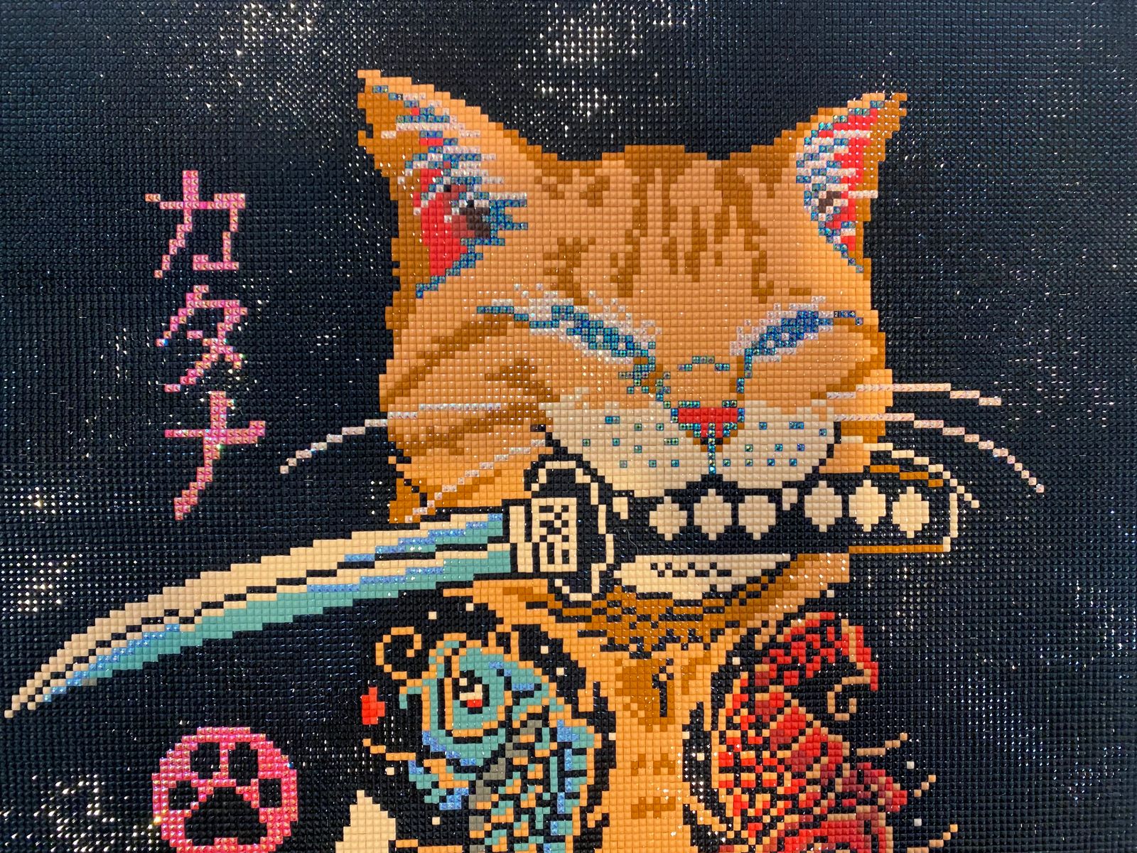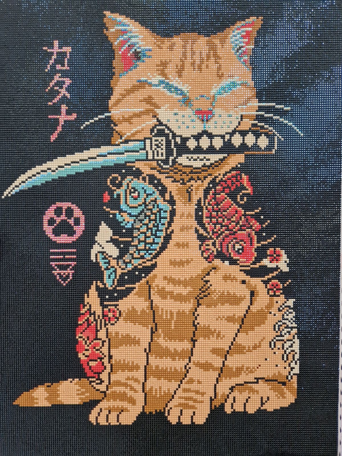 This canvas is very fun to do if you're a beginner. It is very repetitive with the amount of black there is, but that makes this project go by really fast. I recommend this canvas if you want a fast project with little pops of color from the specialty drills that this kit comes with. Also, who could say no to this cute Catana 😺