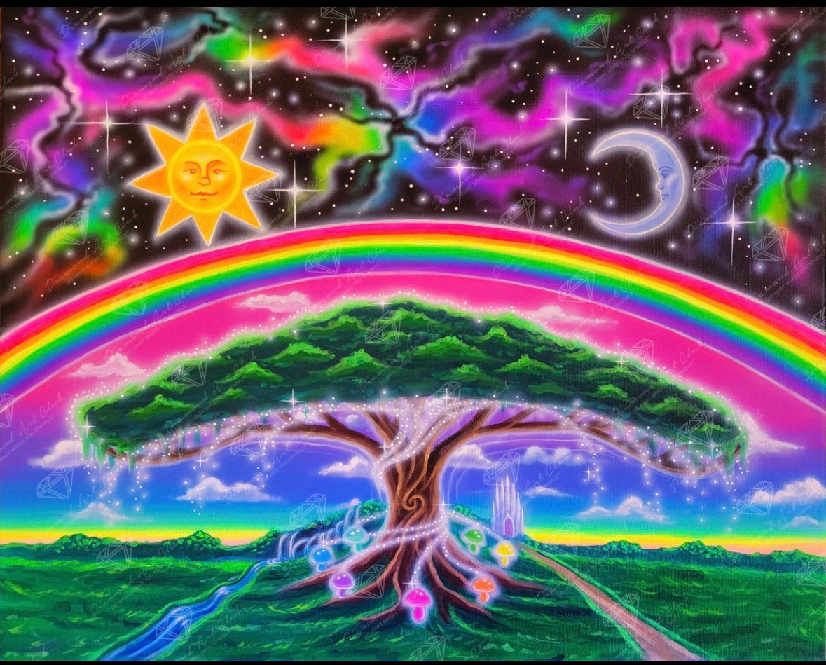 Follow the path into a vibrant dreamscape filled with endless wonder. The sun and moon watch over a radiant tree of life from which sparkling energy pulsates with creativity.