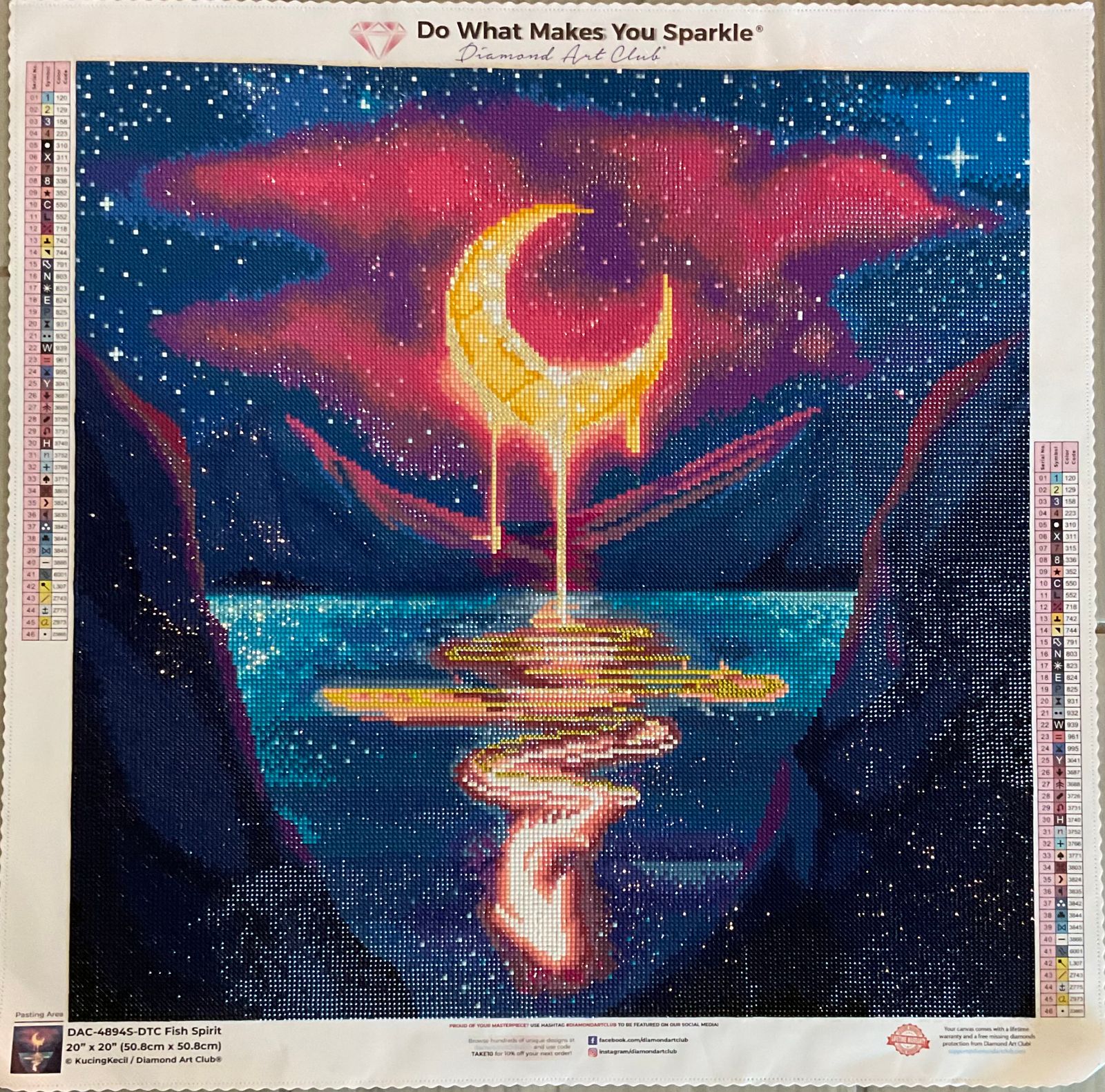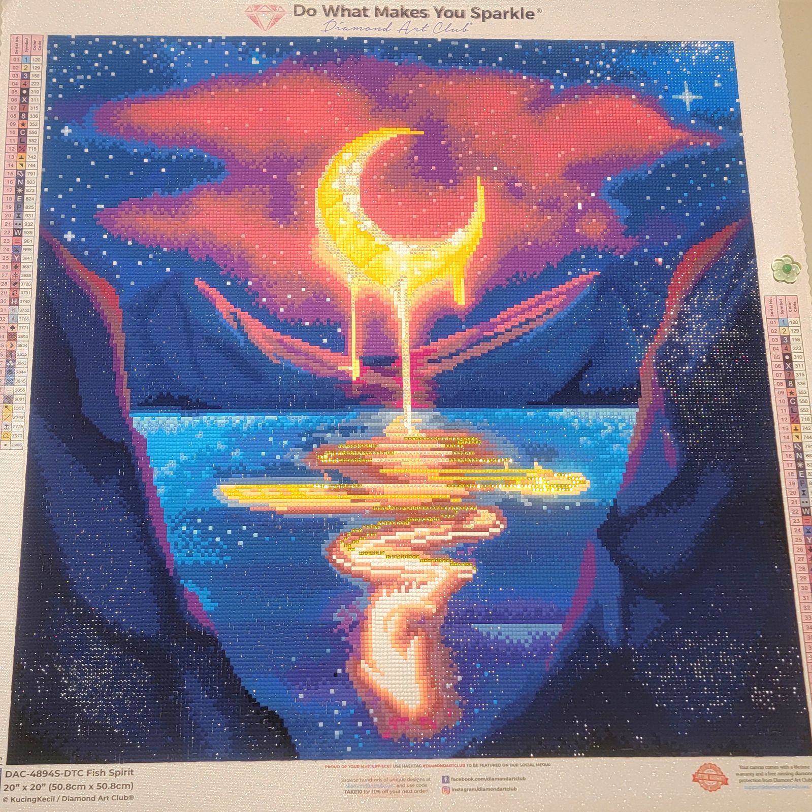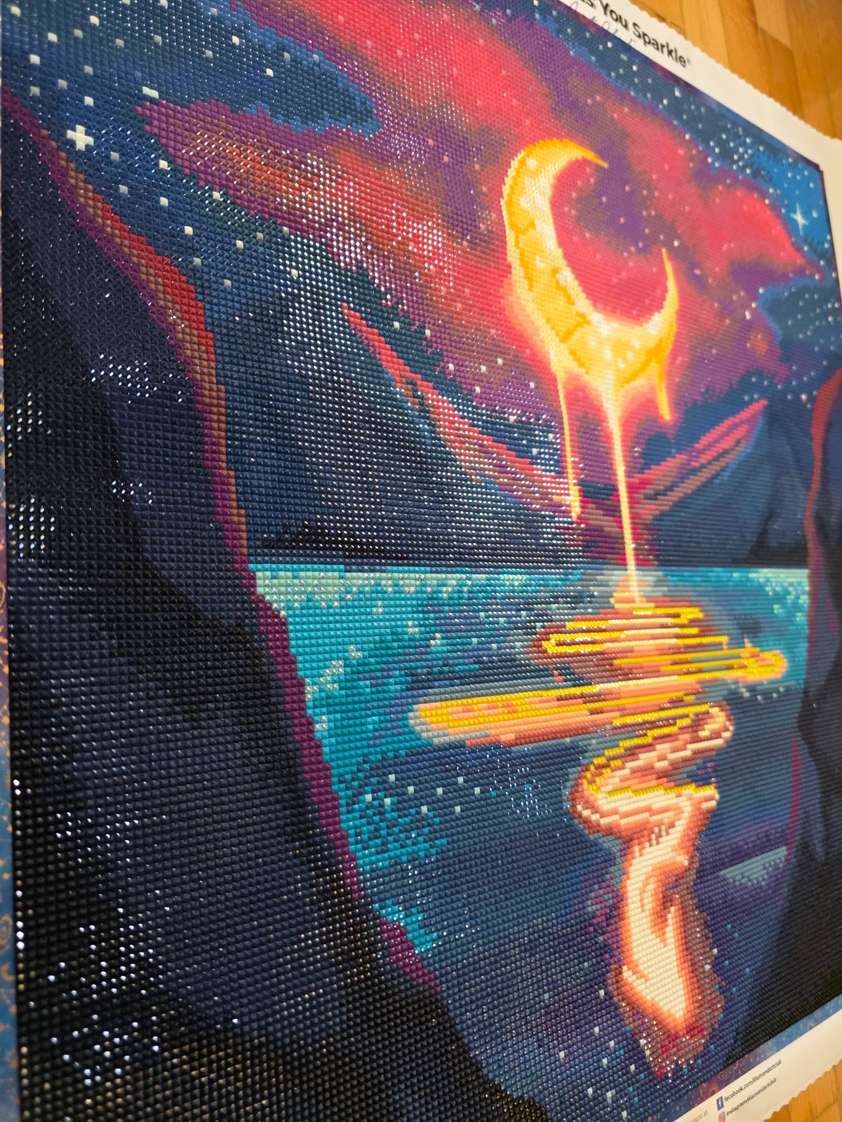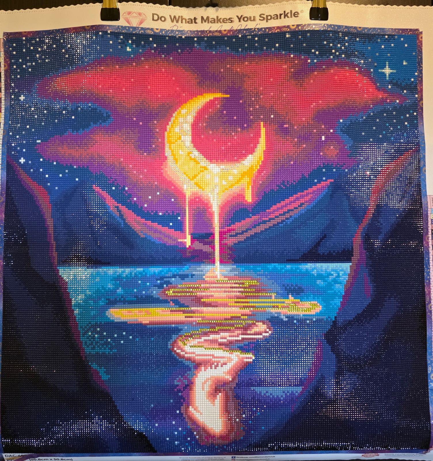 I loved doing this piece. It was relatively easy, not a ton of confetti but not so much color blocking that it got boring. The only thing I don't like is the colors in the water from the dripping moon. The shiny drills look really pretty, but the pink and purple around it are a little weird and don't really look like the reflection I think it's going for. From a distance it looks much better, but maybe consider color swapping if it bothers you!