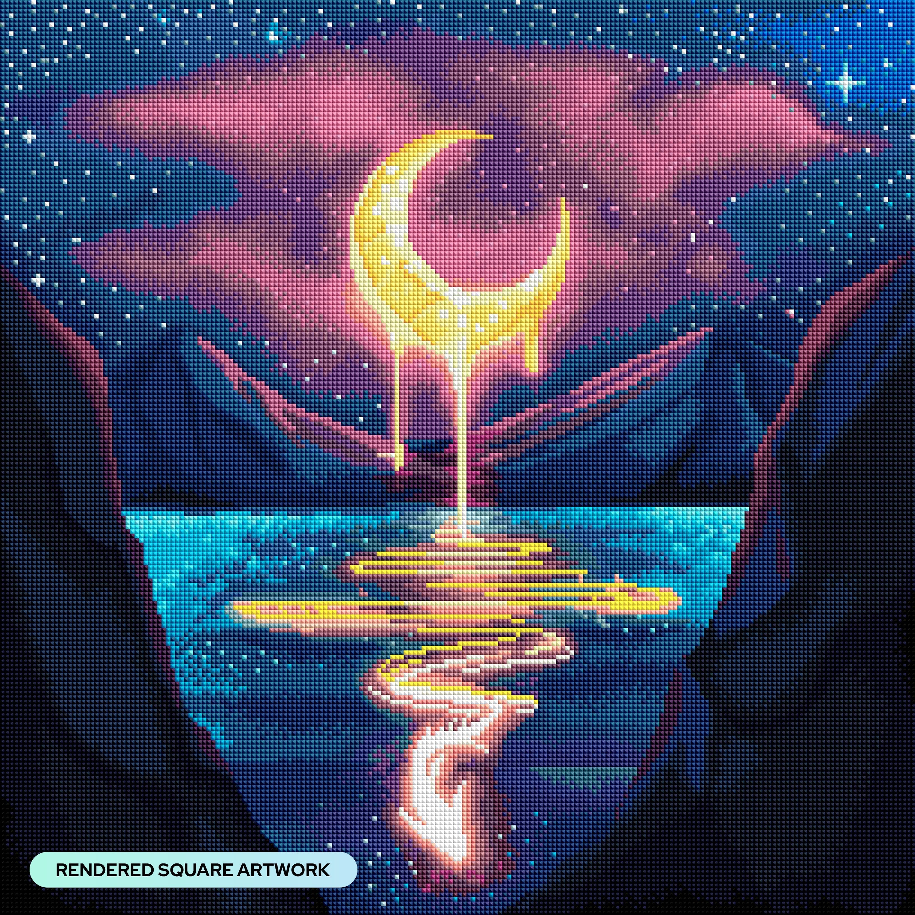 Gaze upon a magnificent crescent dripping its gold into a cosmic sea. The ripples of moon-shine intertwine with a spirited swimmer streaming in its wake.