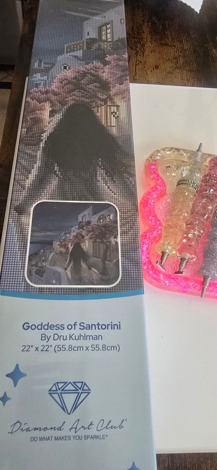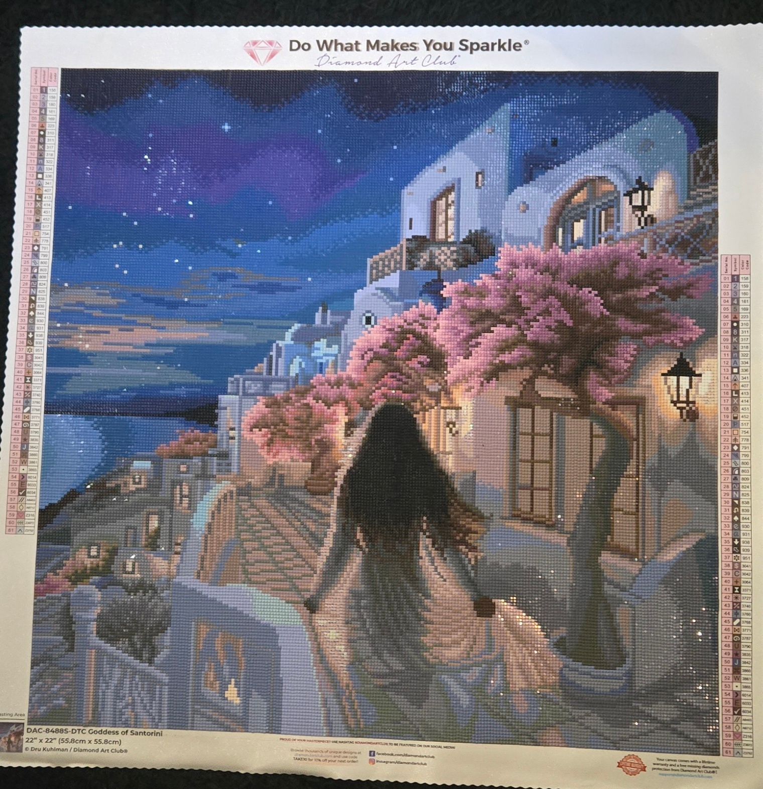 Goddess of Santorini is as beautiful as the island itself! It reminds me of the side streets on the island of Santorini, so happy I was able to get this before it sold out. I have all the goddess Diamond art club pieces except the wisteria and the Stone Temple I pre-ordered Stonehenge. I’m waiting for that to arrive any day now. Hopefully the artist makes a new one because they are absolutely exquisite. I highly recommend them beautiful detail to the goddess herself and the place she’s in.