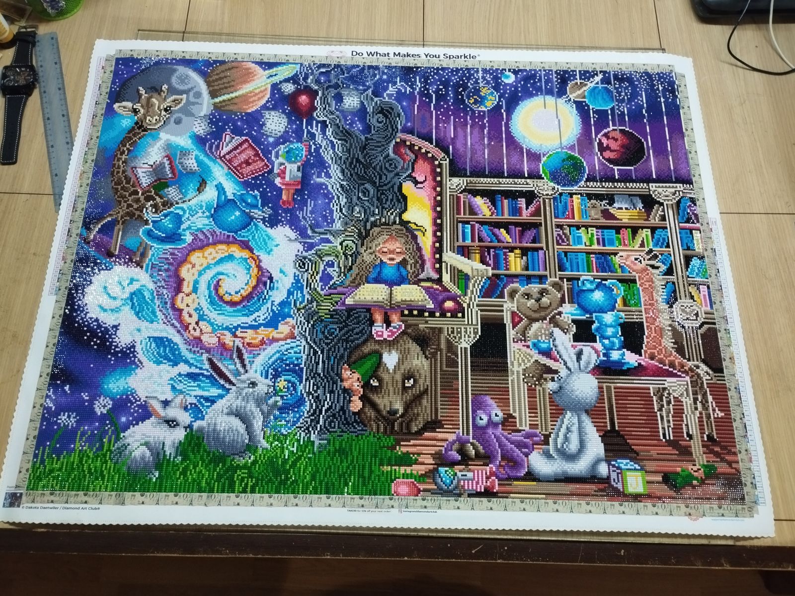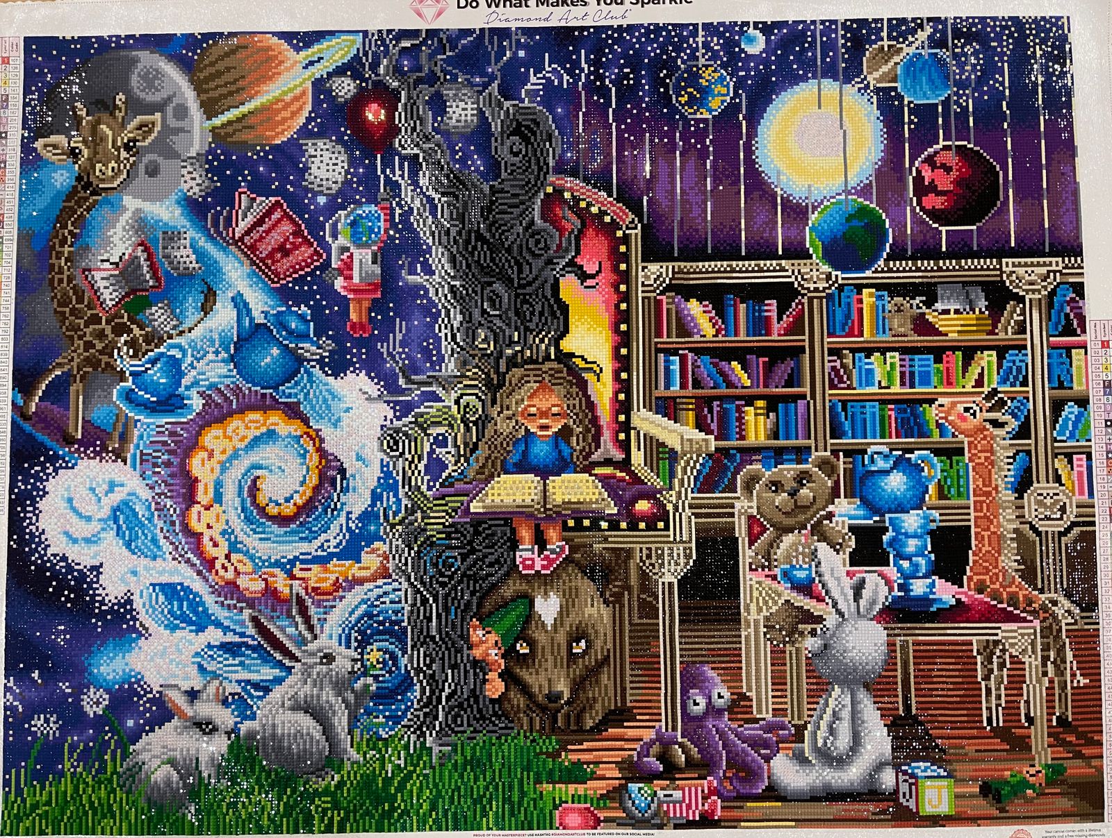 Loved this painting. In every section, there was more and more detail shown. I love Dakota Daetwiler paintings, I did this and donated to my local elementary school library. They absolutely loved it and it is now hanging in the main library. The students were shown it and were told how reading helps your imagination and dreams soar. Thank you to DD and DAC for putting out the beautiful painting.