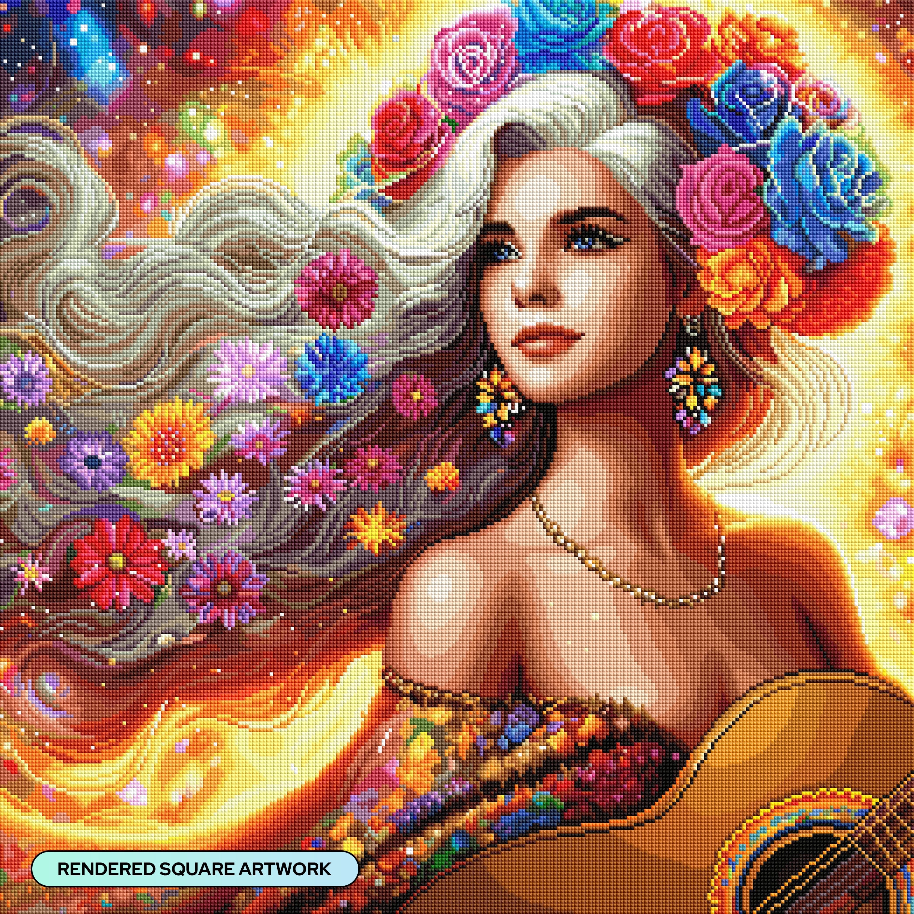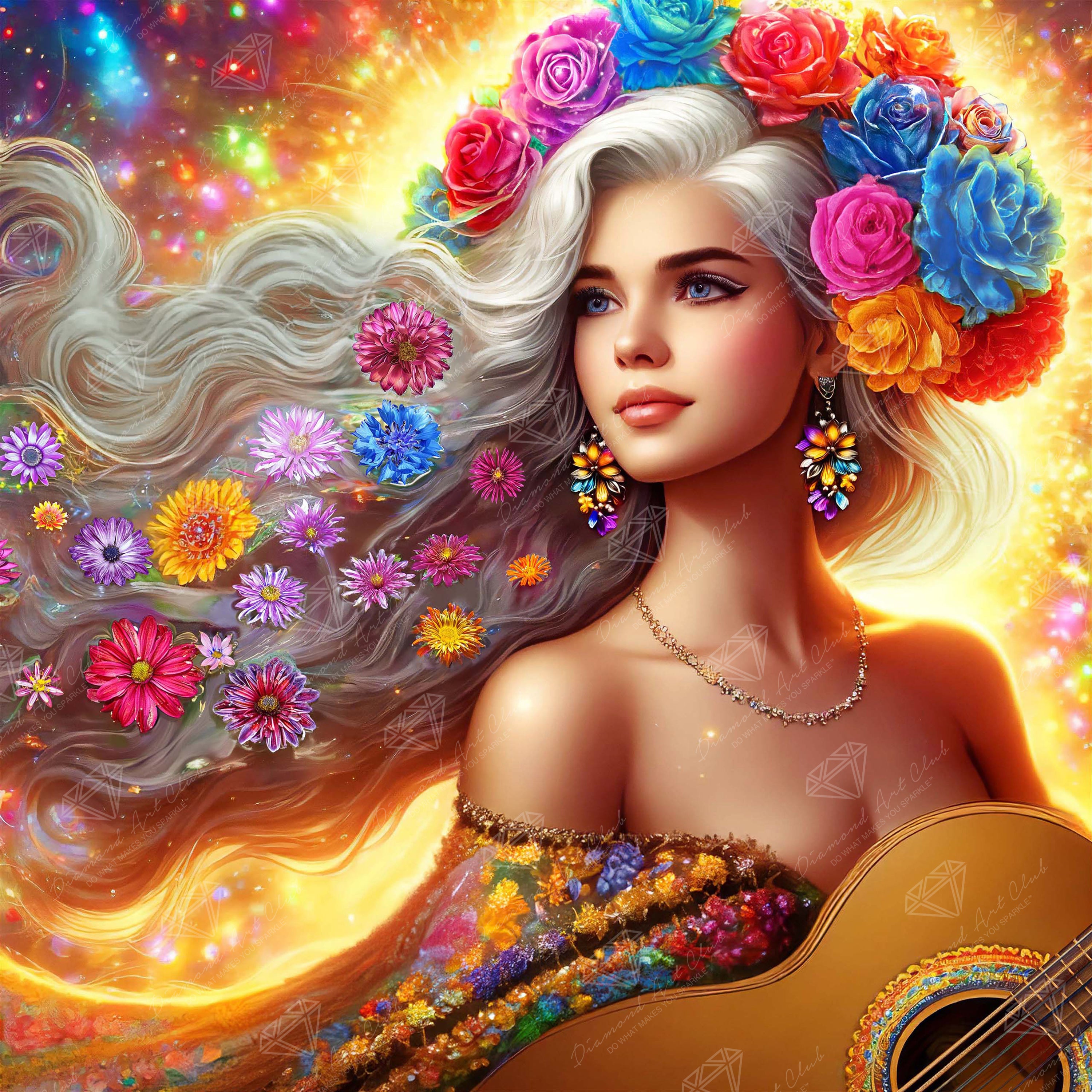 Strum a glittering melody beneath a sky bursting with golden radiance. Crowned with a multitude of colorful flora, your notes blossom into a garden of light and joy.