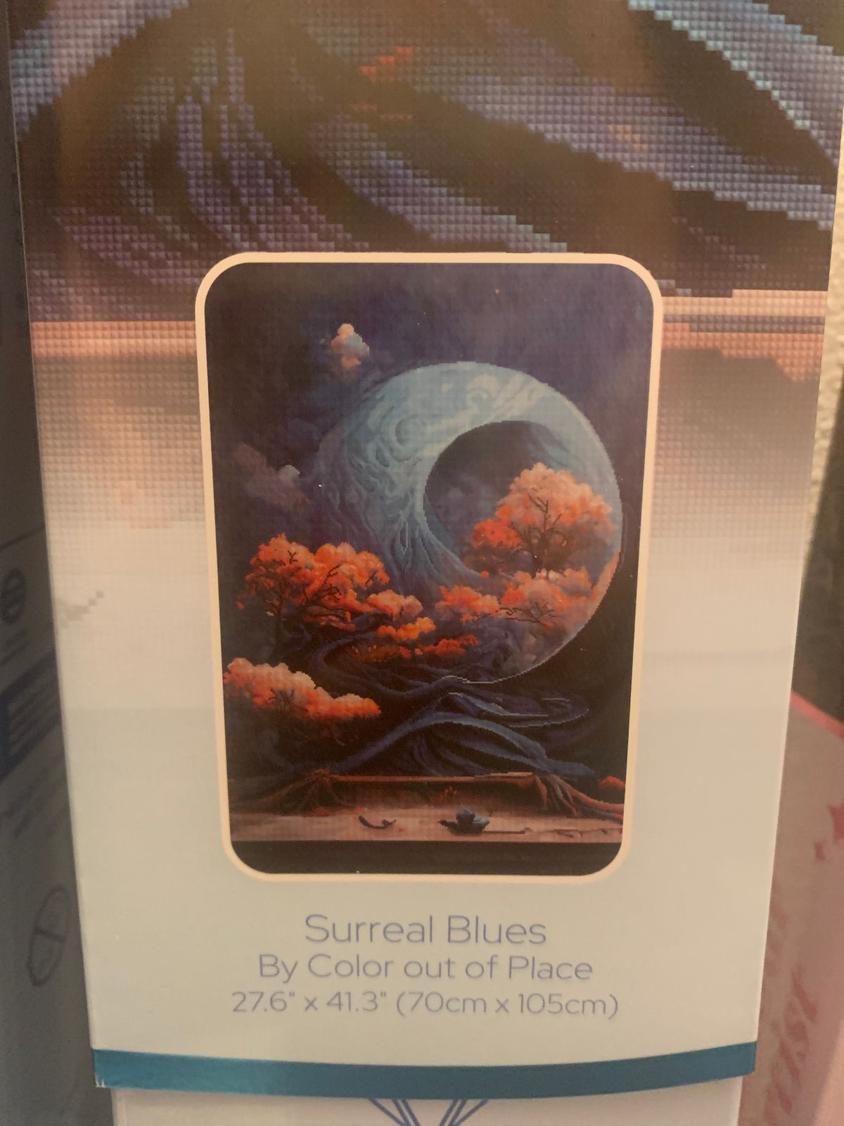 Almost halfway done and it already looks amazing. Working with all the different blues never got tedious, though to be fair, there's a lot of blue :) I feel like the contrast between the moon and the trees looks even better in person, compared to the reference picture