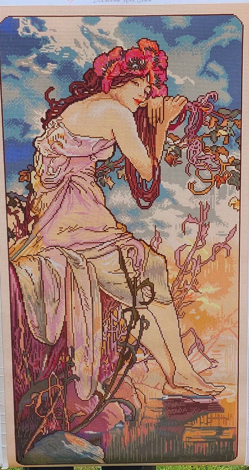 I love Mucha and knew I wanted to do a diamond painting of his work. This was not my first choice but was what was available at the time. I had a great experience working on this and a new appreciation for this work. I thought the rendering was great, especially her face. A good mix of color blocking and confetti kept things interesting. The ABs charted were also really well placed.