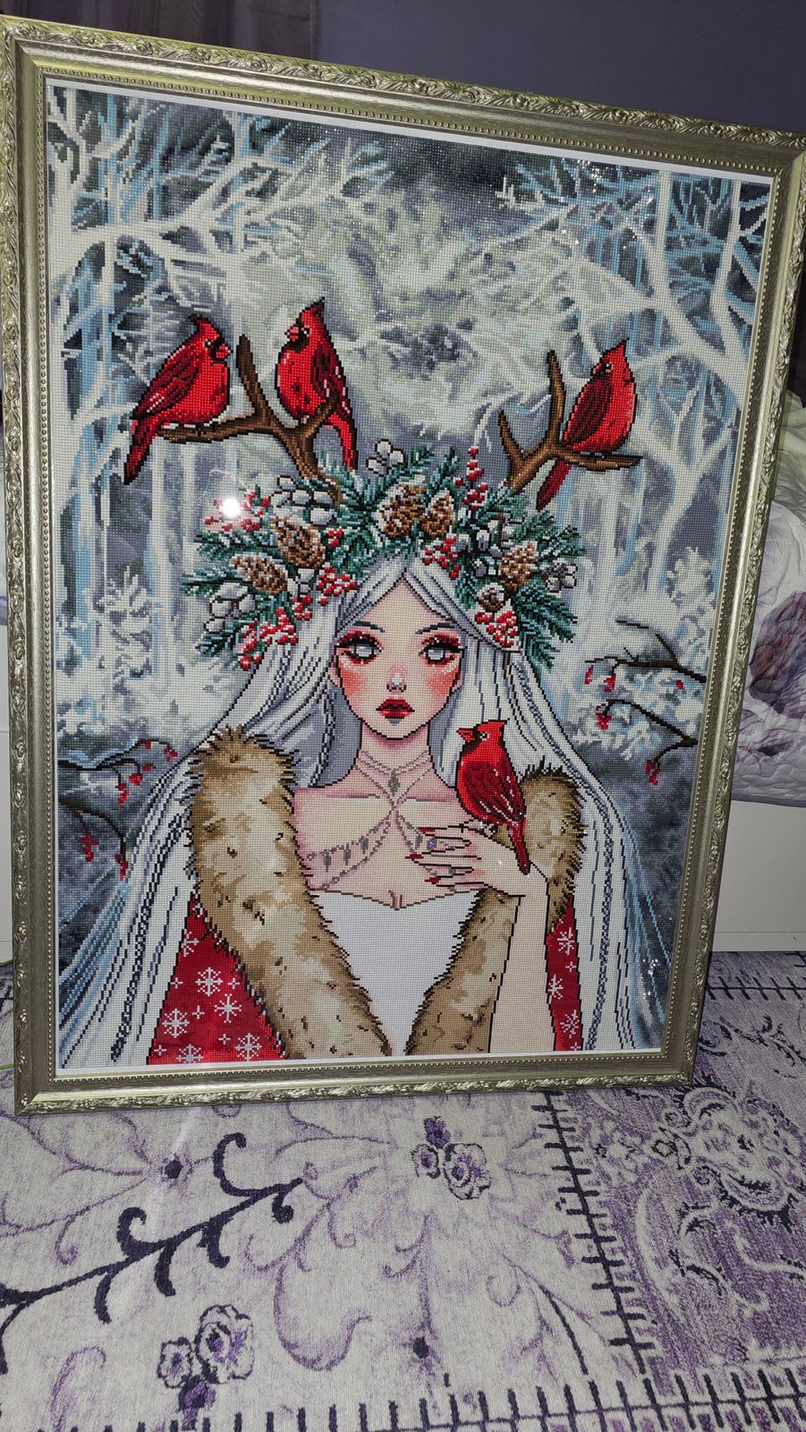 Behold the beauty of winter with this ethereal maiden, adorned with a crown of pine and accompanied by vibrant red cardinals. Her lovely grace and the frosty landscape create a captivating scene.