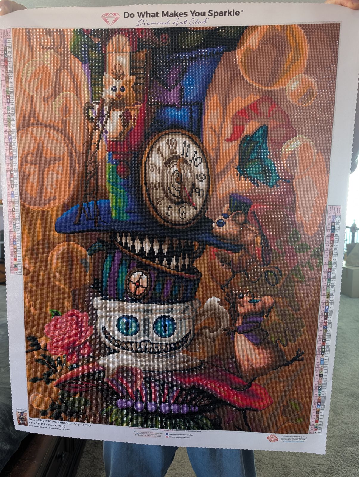 Finished Wonderland.....Find Your Way. I really loved working on it until the very end and the drills got a little tight and started popping. I hung in there and was so happy when the last drill was placed. I love the image so much!!!! I had more than enough drills to complete the canvas and not too many trashy drills other than the 310s. I loved all of the colors. One thing to mention about the cup on the top left of the canvas that the little mouse is sitting in. In the picture, the cup is more white with purple diamonds. In the finished painting, it is more of a cream color with burgundy and purple diamonds.
