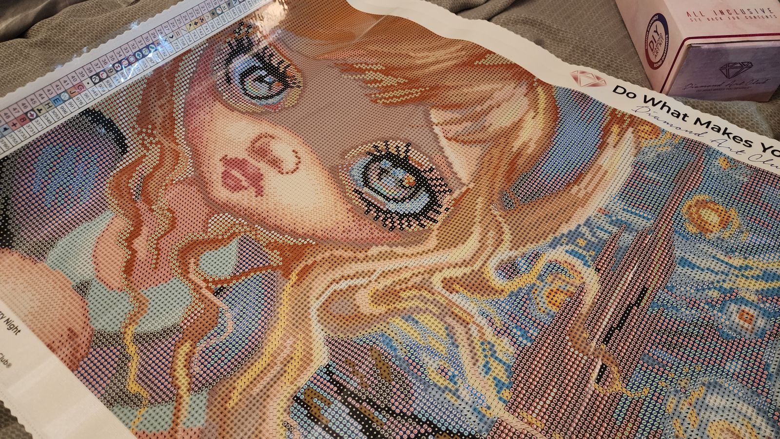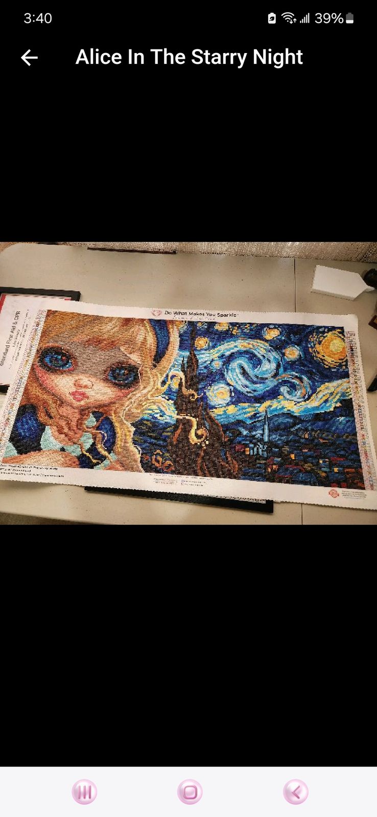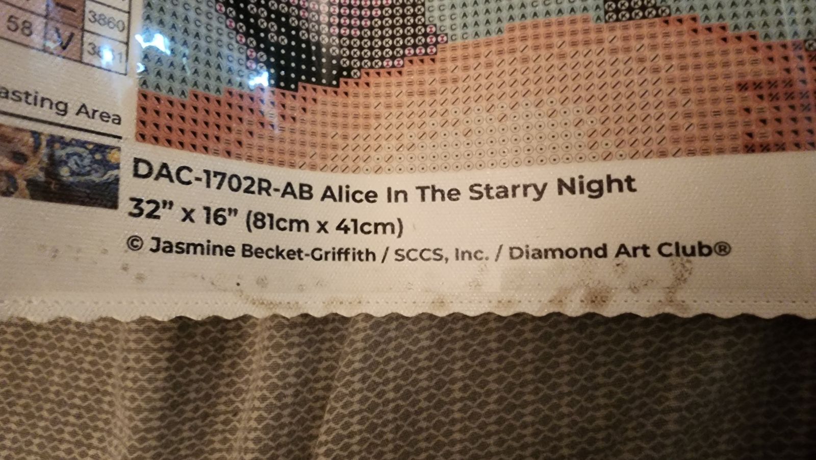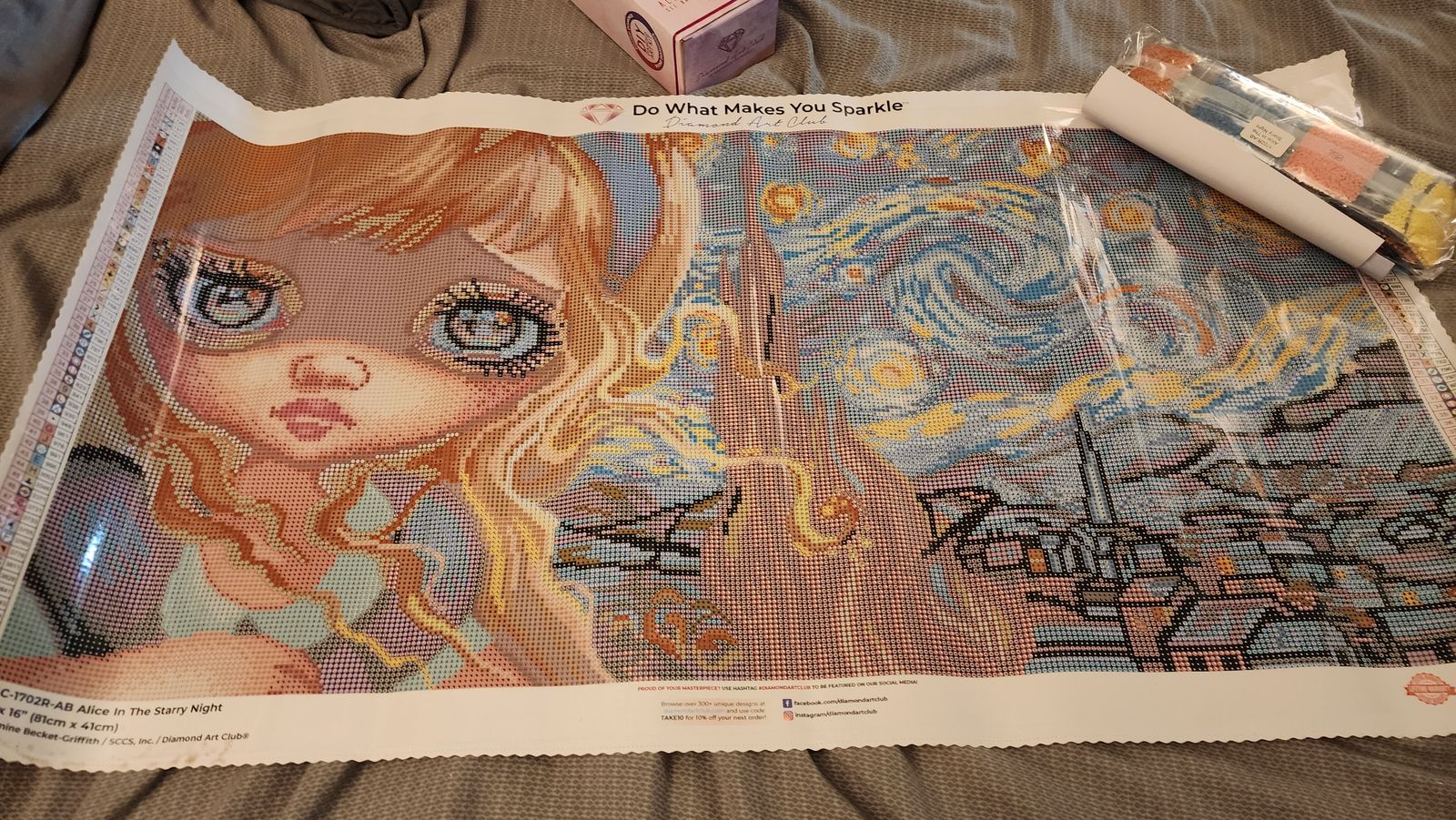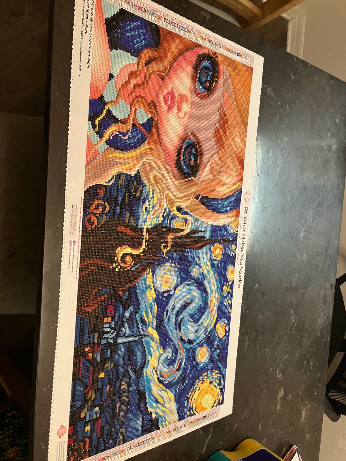 I love this version on Starry Night themed by Vincent Van Gogh. The whole Diamond Art kit was fabulous in quality. I'm a beginner in Diamond Paintings art. This hasn't been started as yet. I want to learn how on some smaller projects first before attempting. More Alice in Wonderland themed Diamond Paintings please!