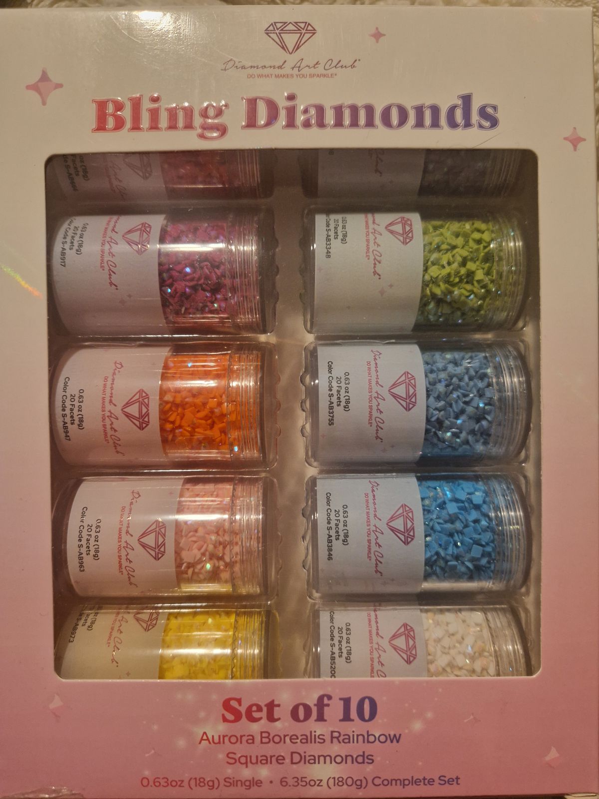 Elevate your diamond painting projects with this curated set of 10 Aurora Borealis square drills. Each jar contains 0.63 oz (18g) of our signature 13 or 20-facet resin drills with a special iridescent coating that enhances your designs with a luminous shimmer.
