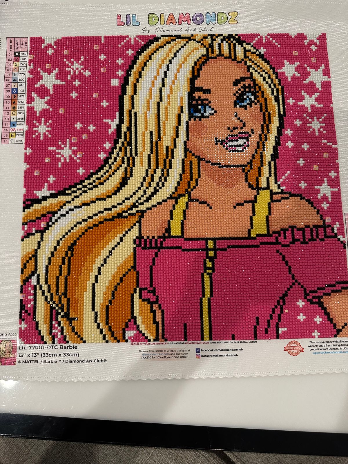 I love my Barbie diamond painting. It has special square large diamonds, fairly dust and ABs. I love the twist and pick pen. It’s ergonomic and has a 4 placer and 7 placer for those of us who are learning to multi place.