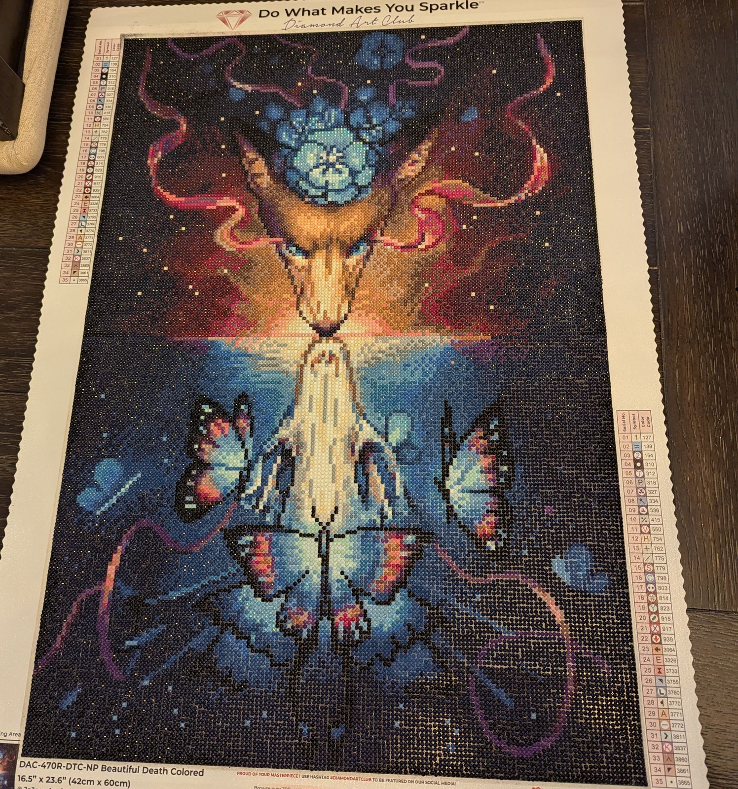 Beautiful Death was truly, as the name suggests, beautiful. I loved the switch of colour palettes between the two sides of the piece and it was such a fun little project to complete. I did notice though that the middle where the two colours meet has quite an odd/stark detail that didn't make it seem as soft as the original picture but I still found that the painting when standing from afar looks stunning. It definitely is a little darker in terms of colours but I especially enjoyed the pop of colour in the middle with the two skulls, butterflies, and ribbons!
