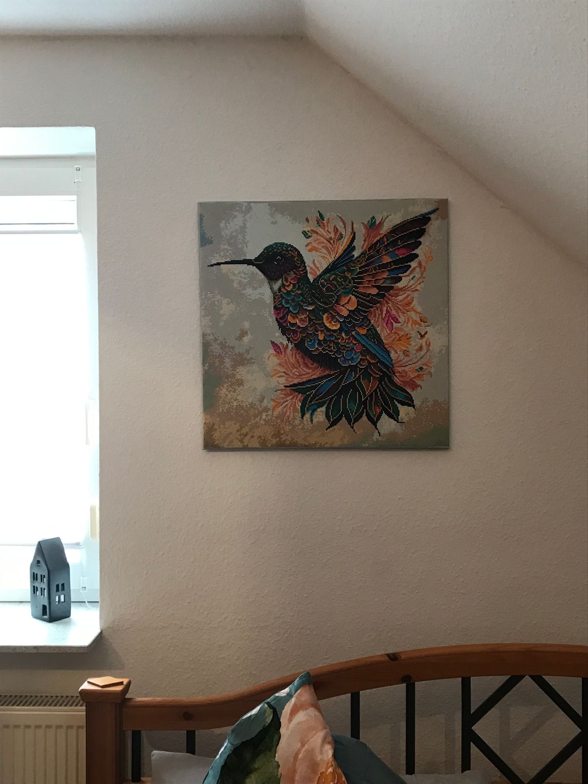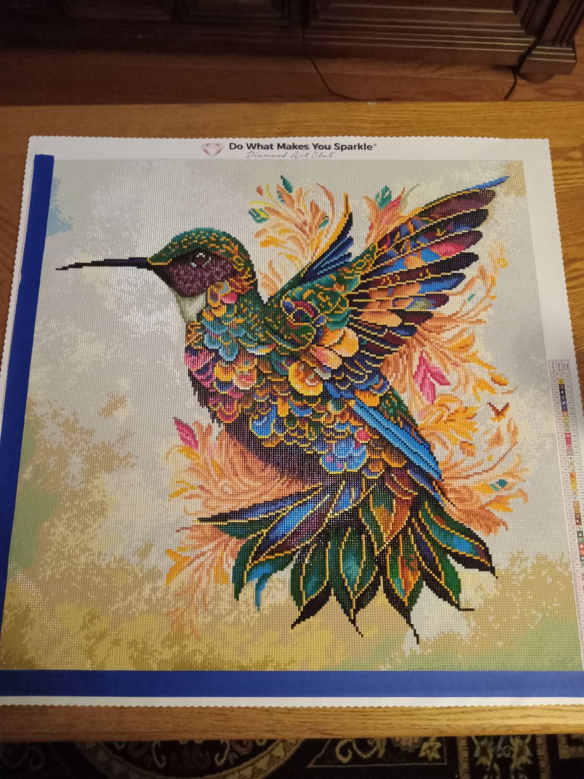 The completed piece is stunning! I had so much fun working on this piece and watching it come to life on the canvas. The canvas, drills, etc. were all high quality. Definitely recommend and especially if you love hummingbirds!